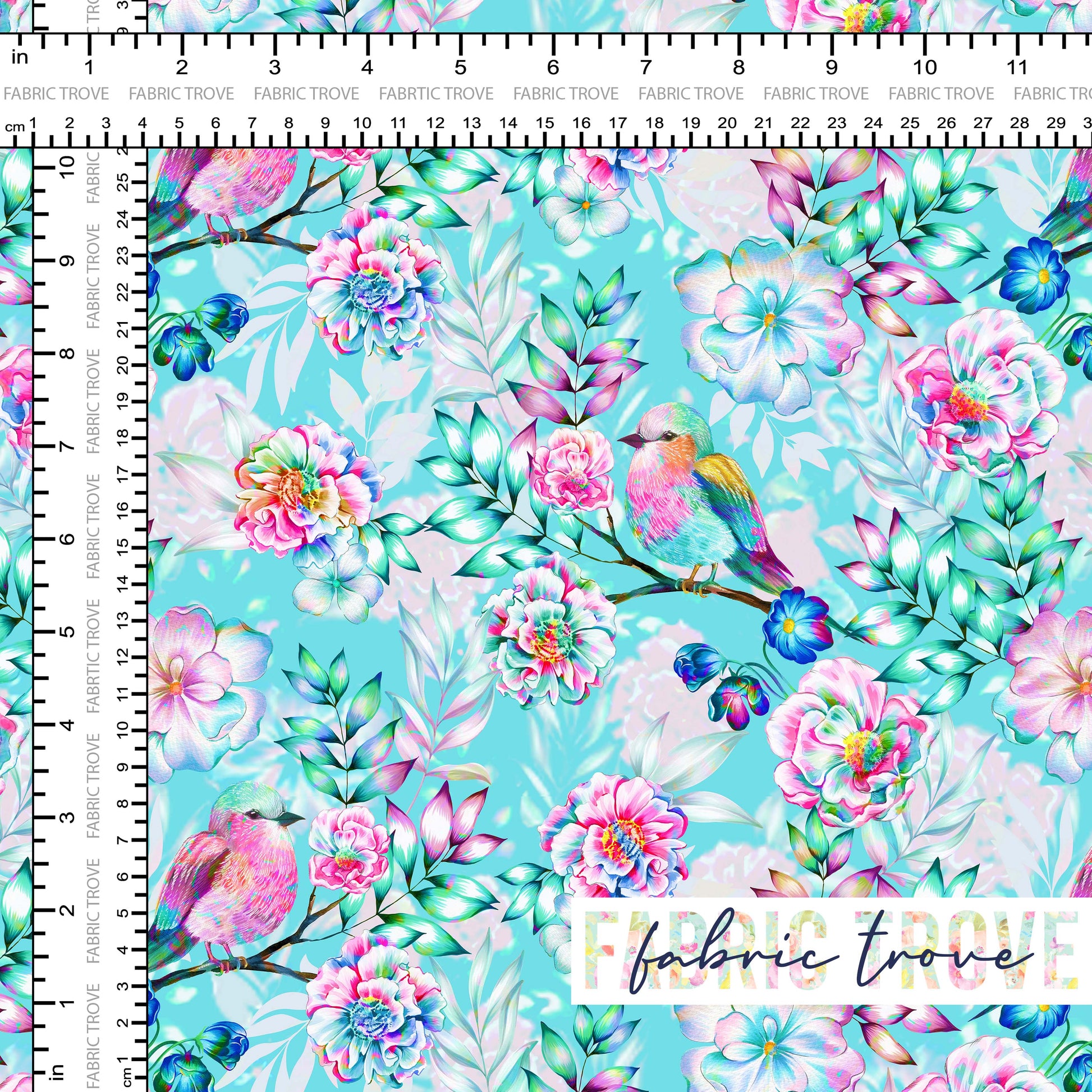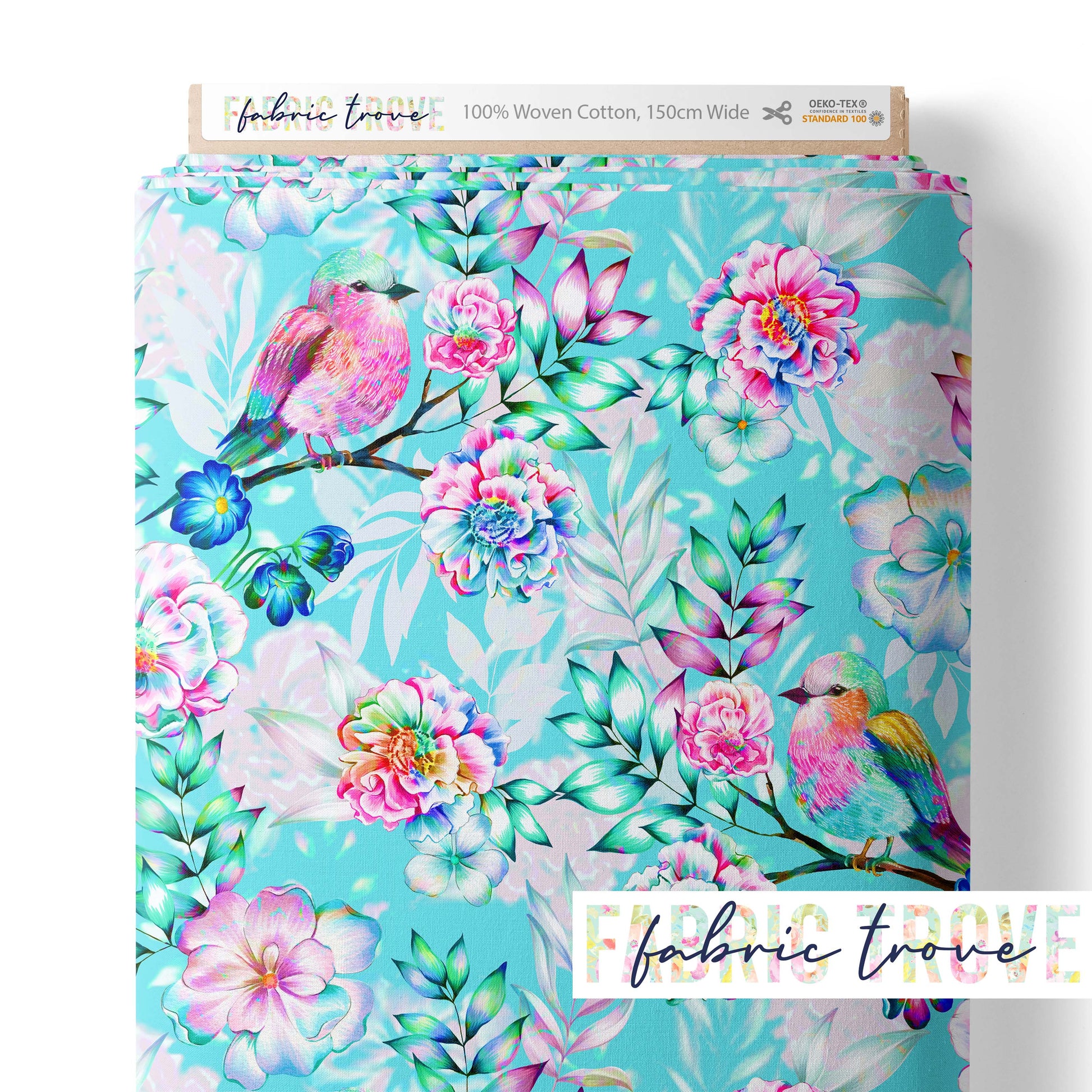 Add vibrant energy to your projects with Sweet Tweet, a stunning print featuring birds and flowers against a blue sky in bright, fluorescent colors on premium cotton fabric.