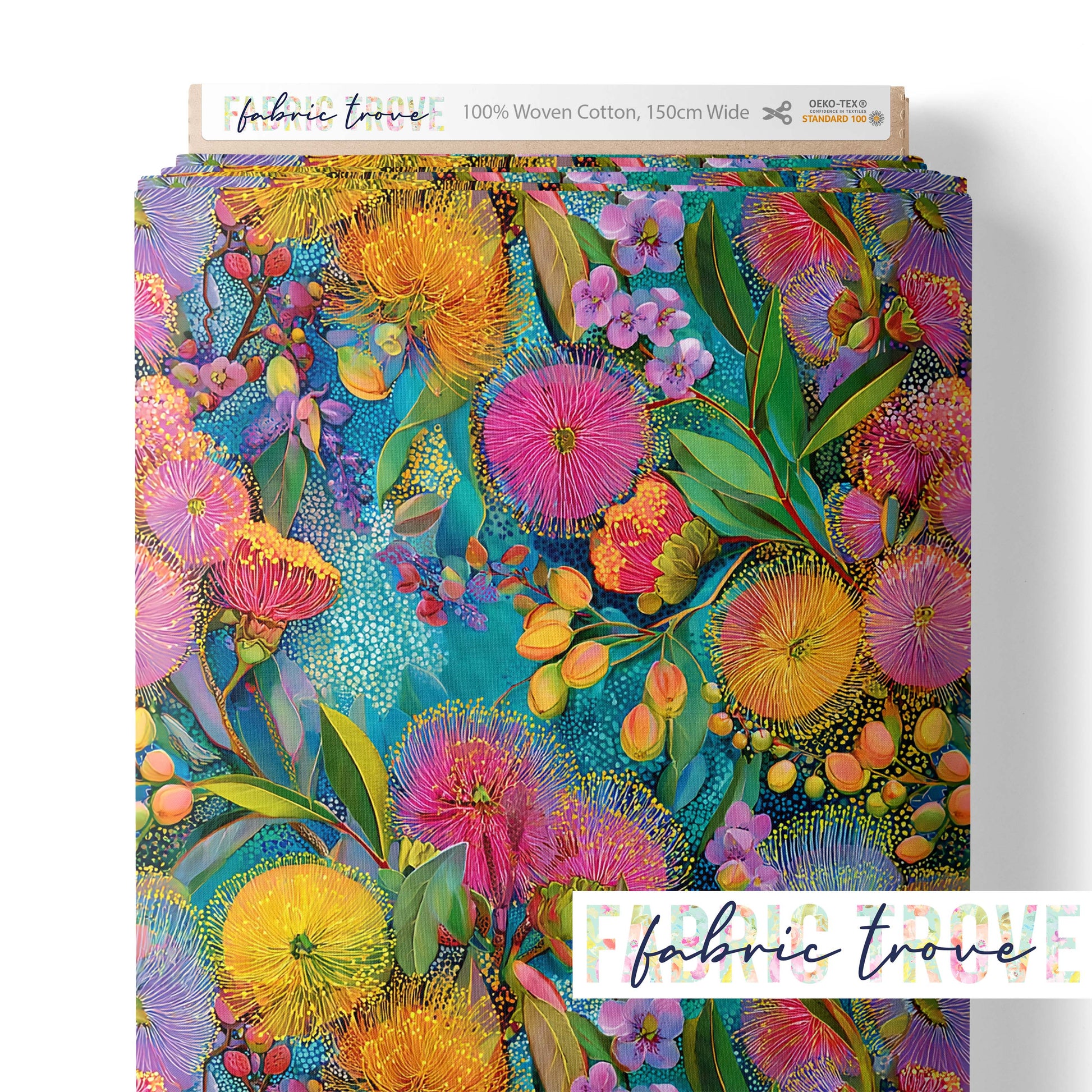Abundant Wattles Aqua is a highly detailed print featuring vibrant wattle blossoms and wildflowers in pink, purple, and gold on a fresh aqua background, brought to life on premium cotton fabric.