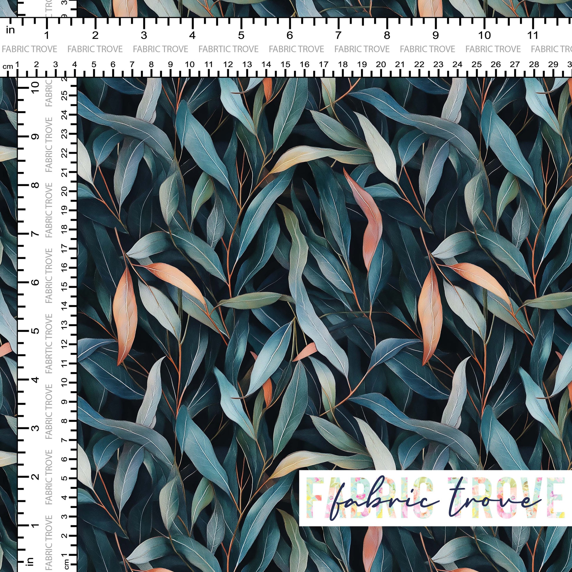 Aussie Dark Leaves is a rich print featuring gum leaves in deep green and brown on a dark background on premium cotton fabric.