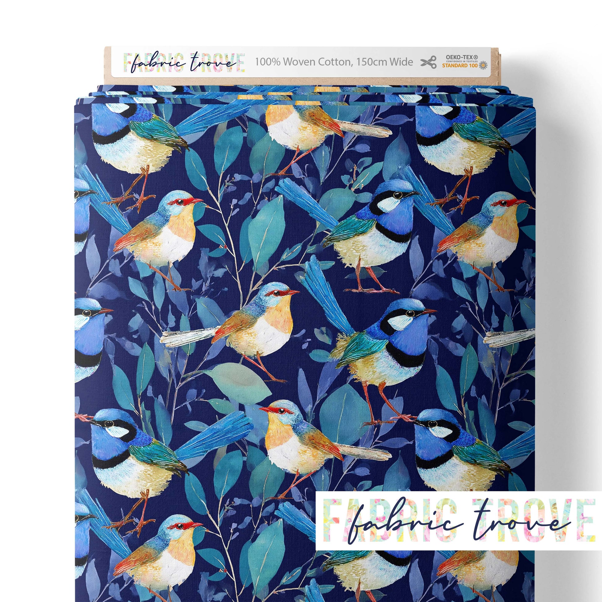 Celebrate Australia's beloved blue wrens with Blue Wren Family, a charming print featuring these iconic birds perched on leafy branches against a rich dark blue background on premium cotton fabric.