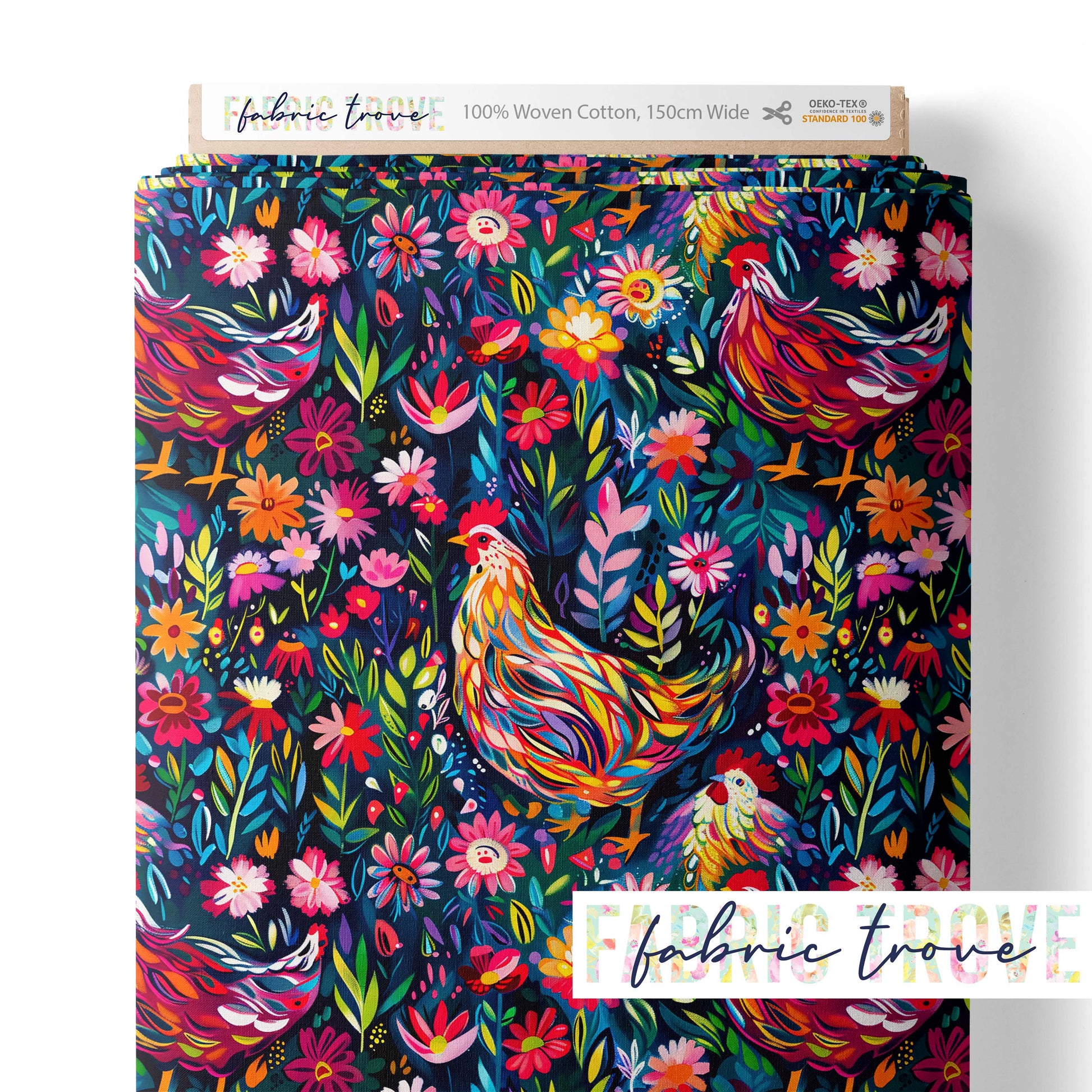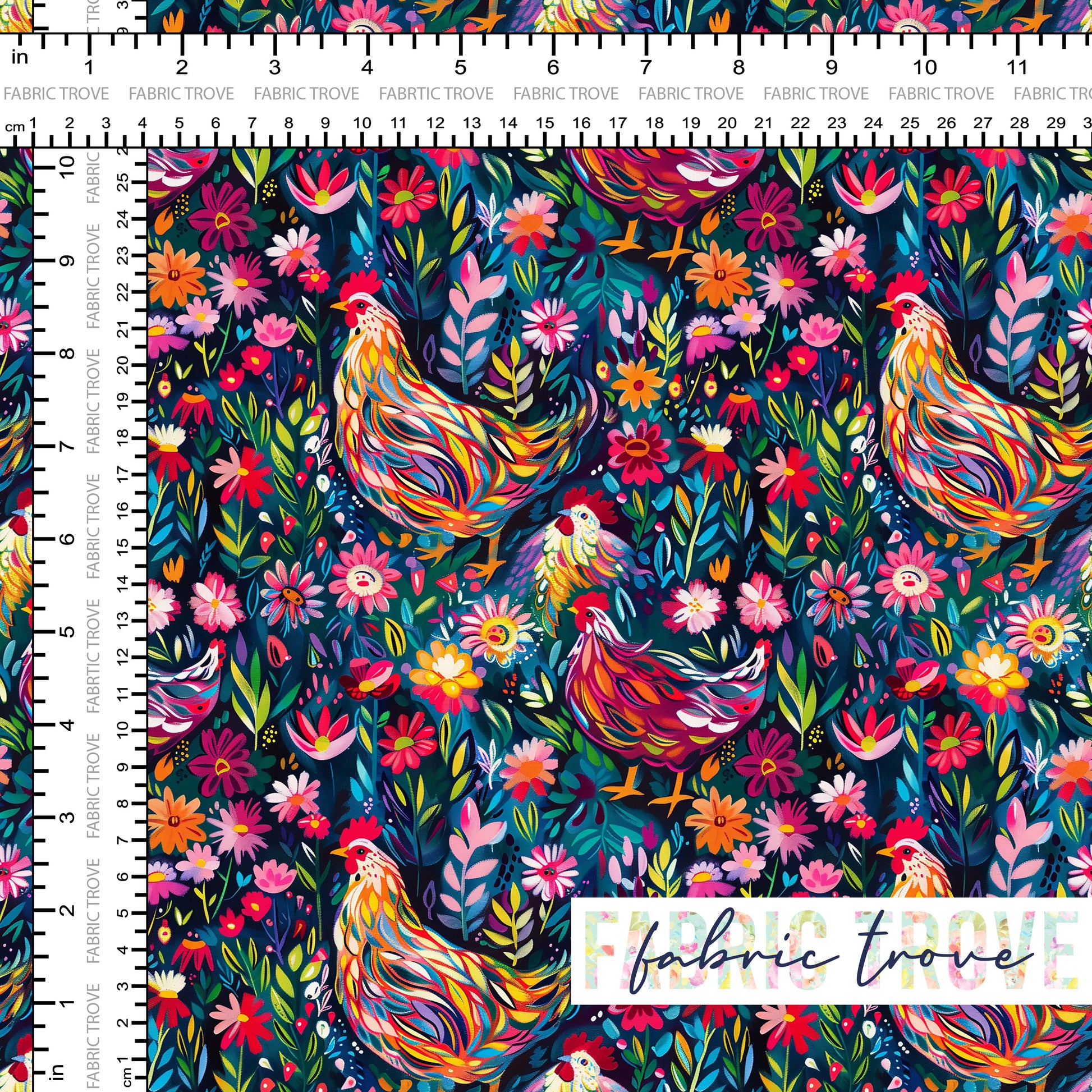 Add cheerful farmyard charm to your projects with Bright Chickens, a delightful print featuring colorful chickens wandering through a vibrant flower garden on premium cotton fabric.
