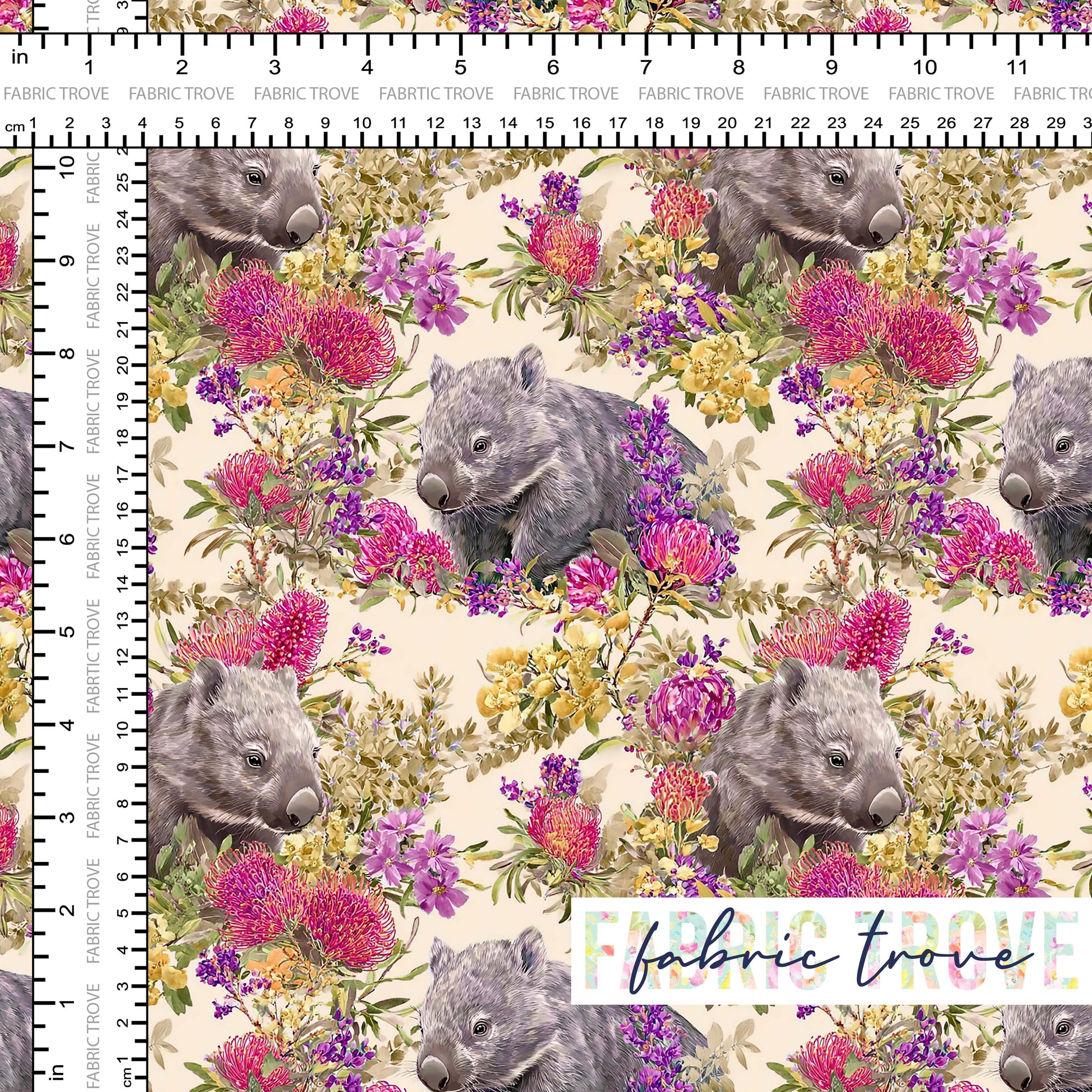 Fantasy Wombat Gold is a charming print featuring grey wombats surrounded by bouquets of wildflowers on a pale gold background, brought to life on premium cotton fabric.