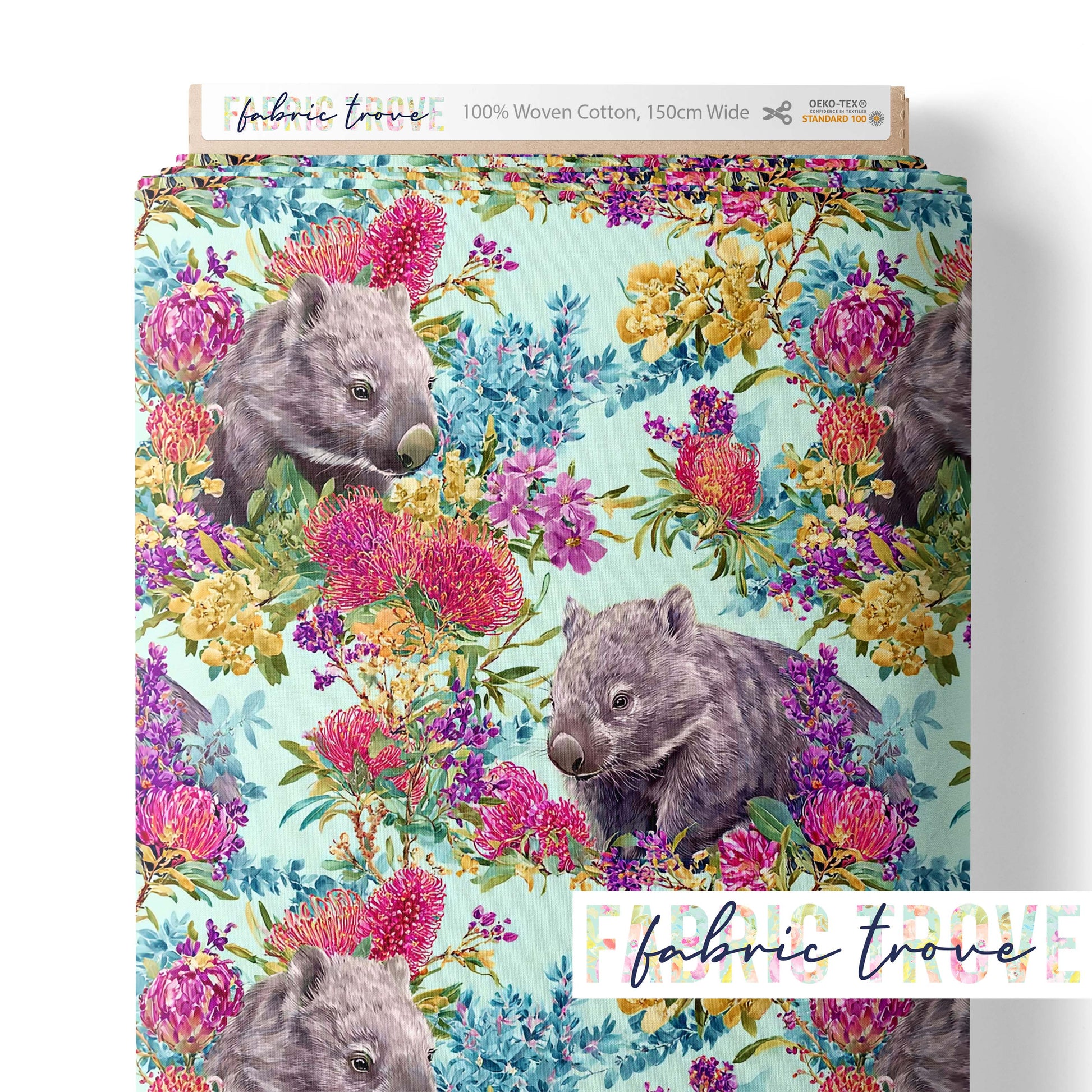 Fantasy Wombat Mint is a charming print featuring grey wombats surrounded by bouquets of wildflowers on a pale mint background, brought to life on premium cotton fabric.