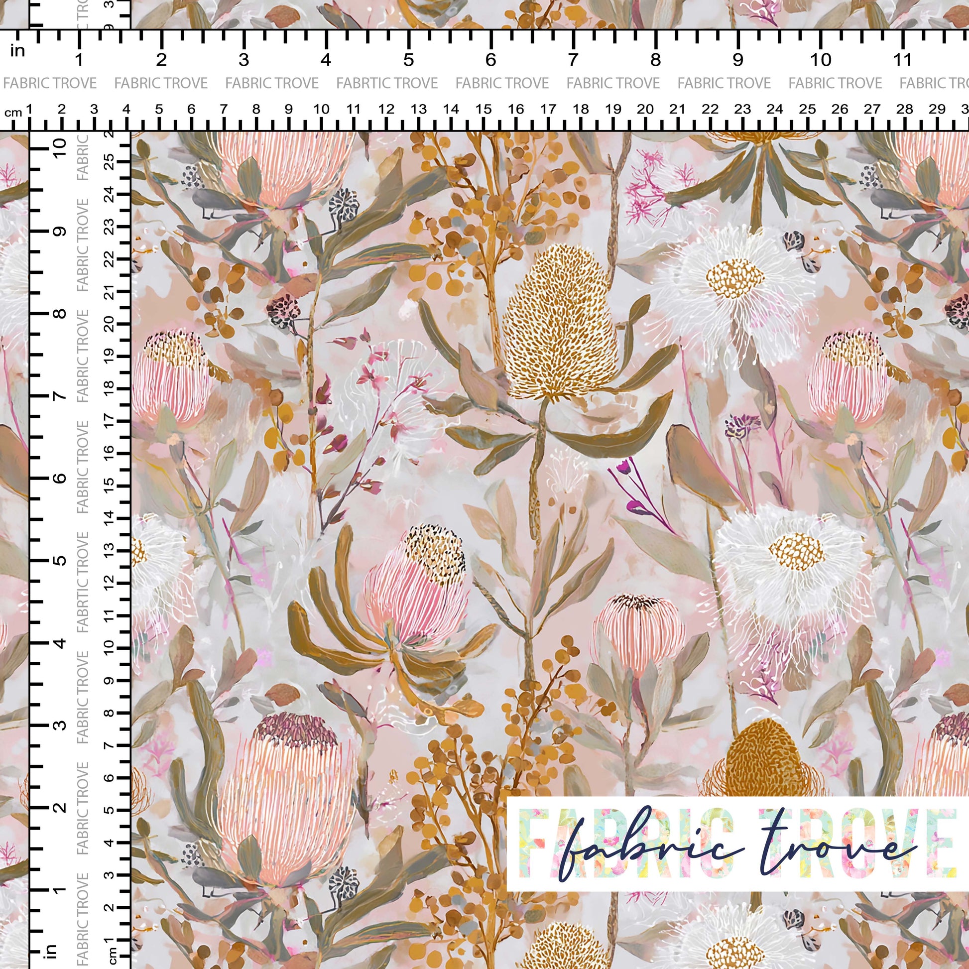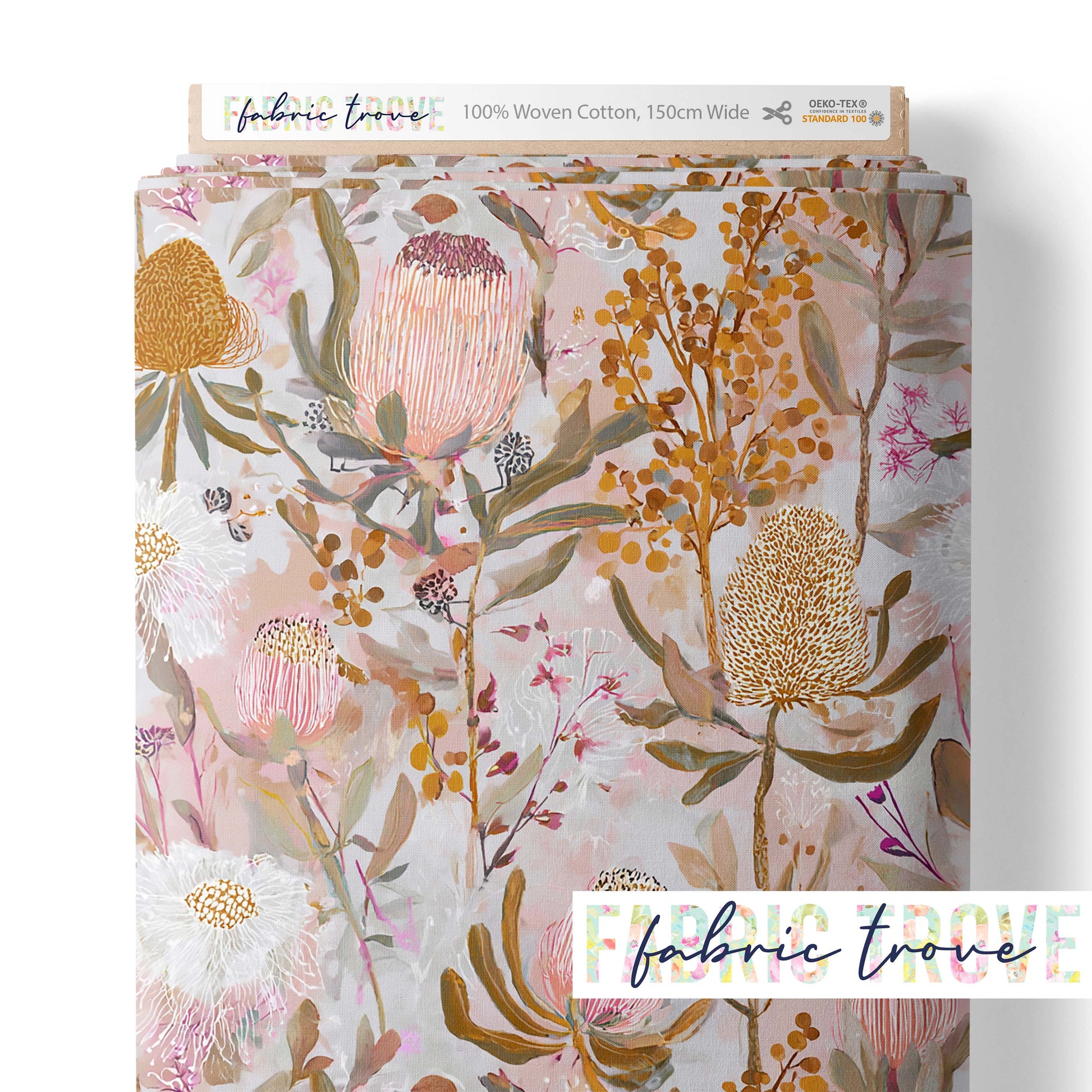 Flora Dreams is a soft print featuring banksia, waratah, and wildflowers in muted pastel tones on a warm tone background, brought to life on premium cotton fabric.