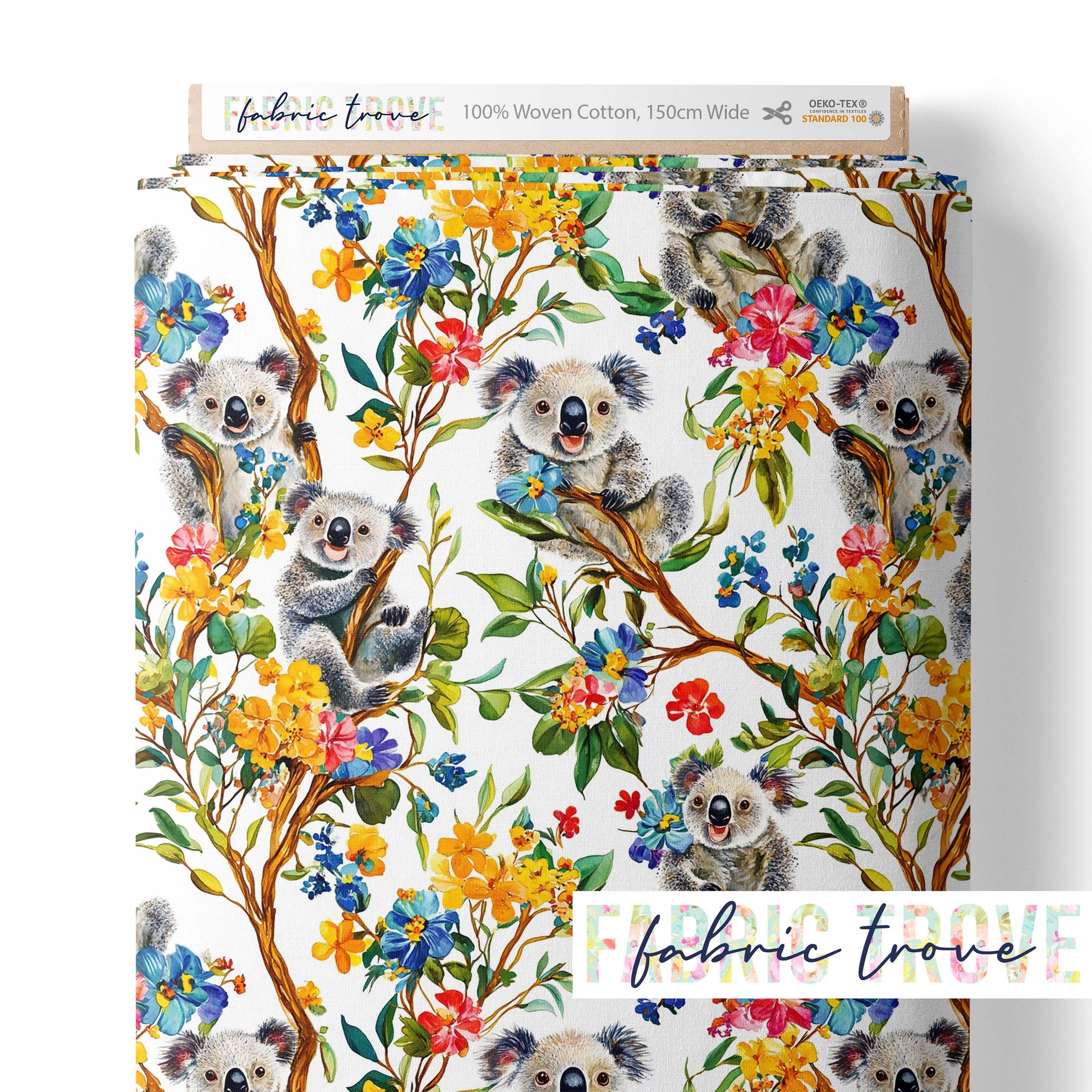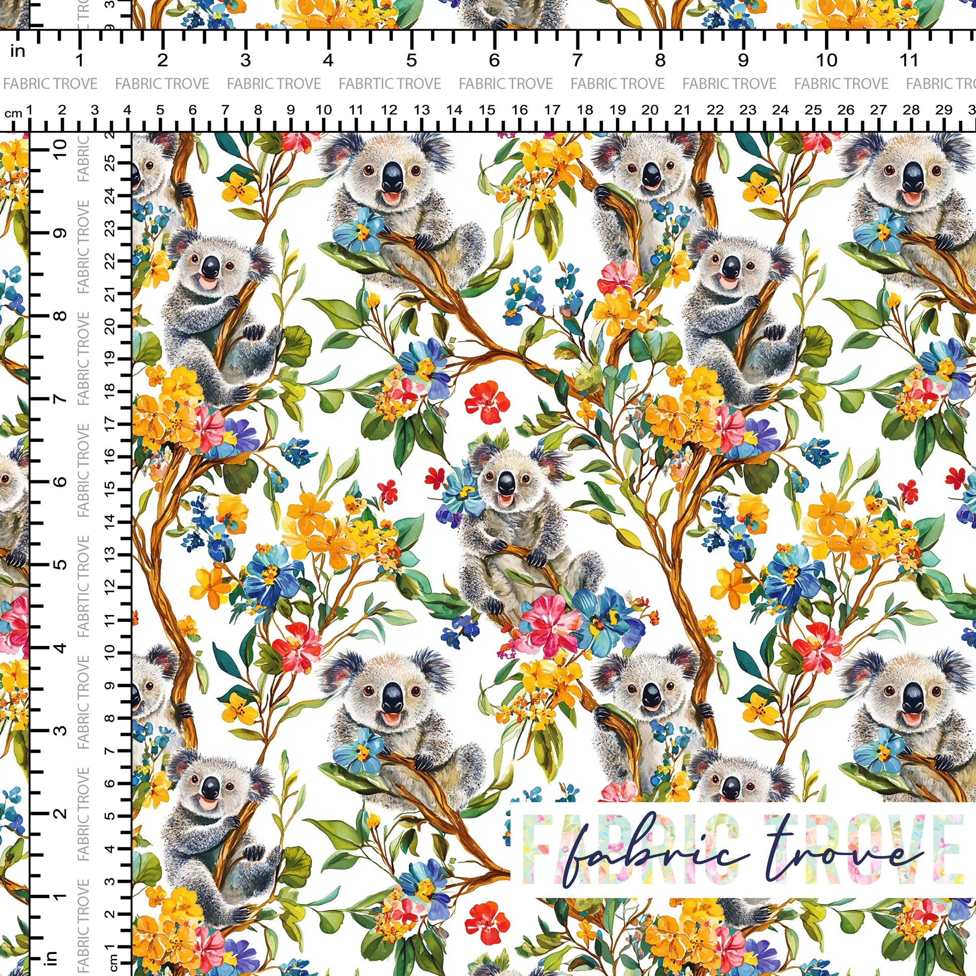 Add adorable Australian charm to your projects with Hanging Around, a sweet print featuring koalas hanging in flowering trees on a clean white background on premium cotton fabric.