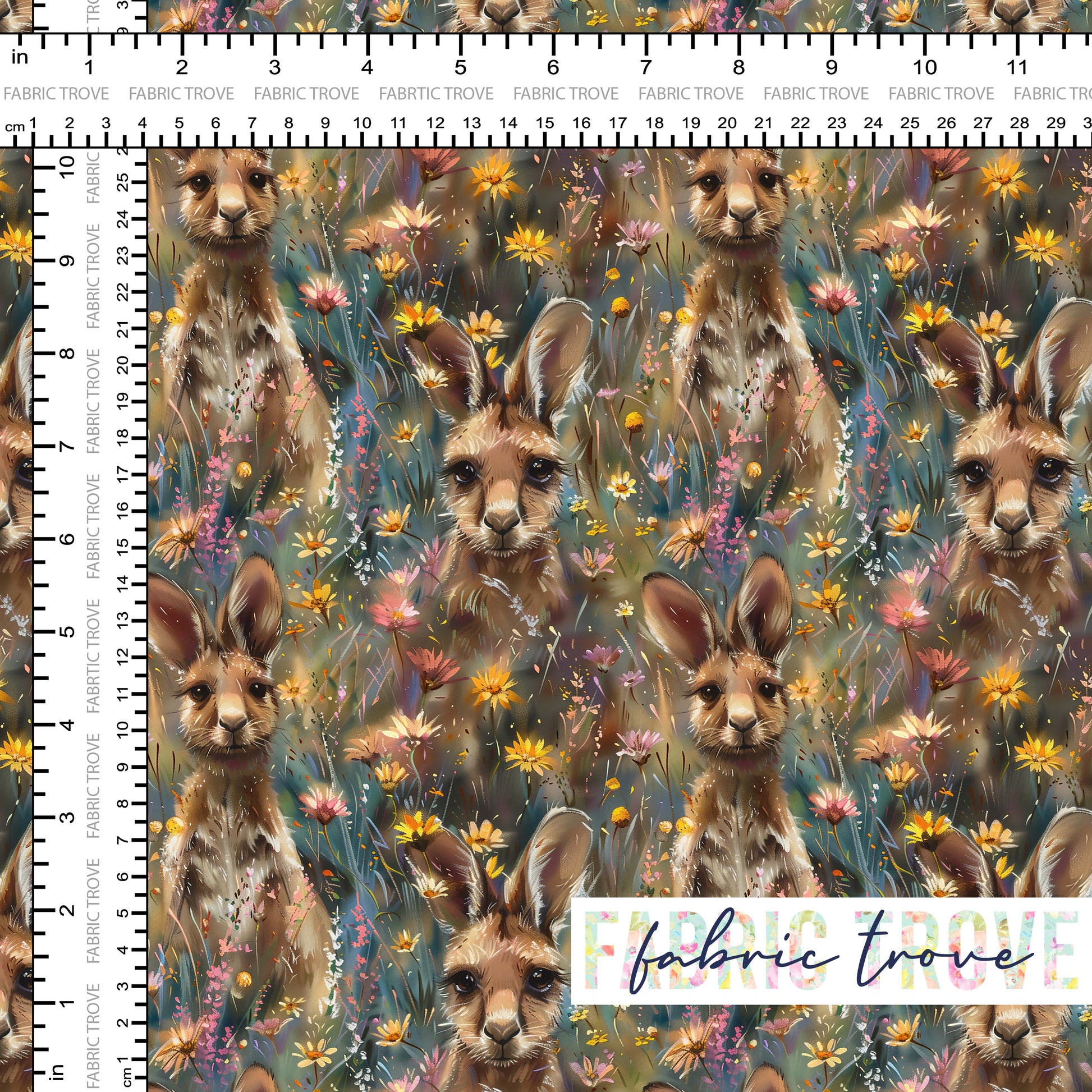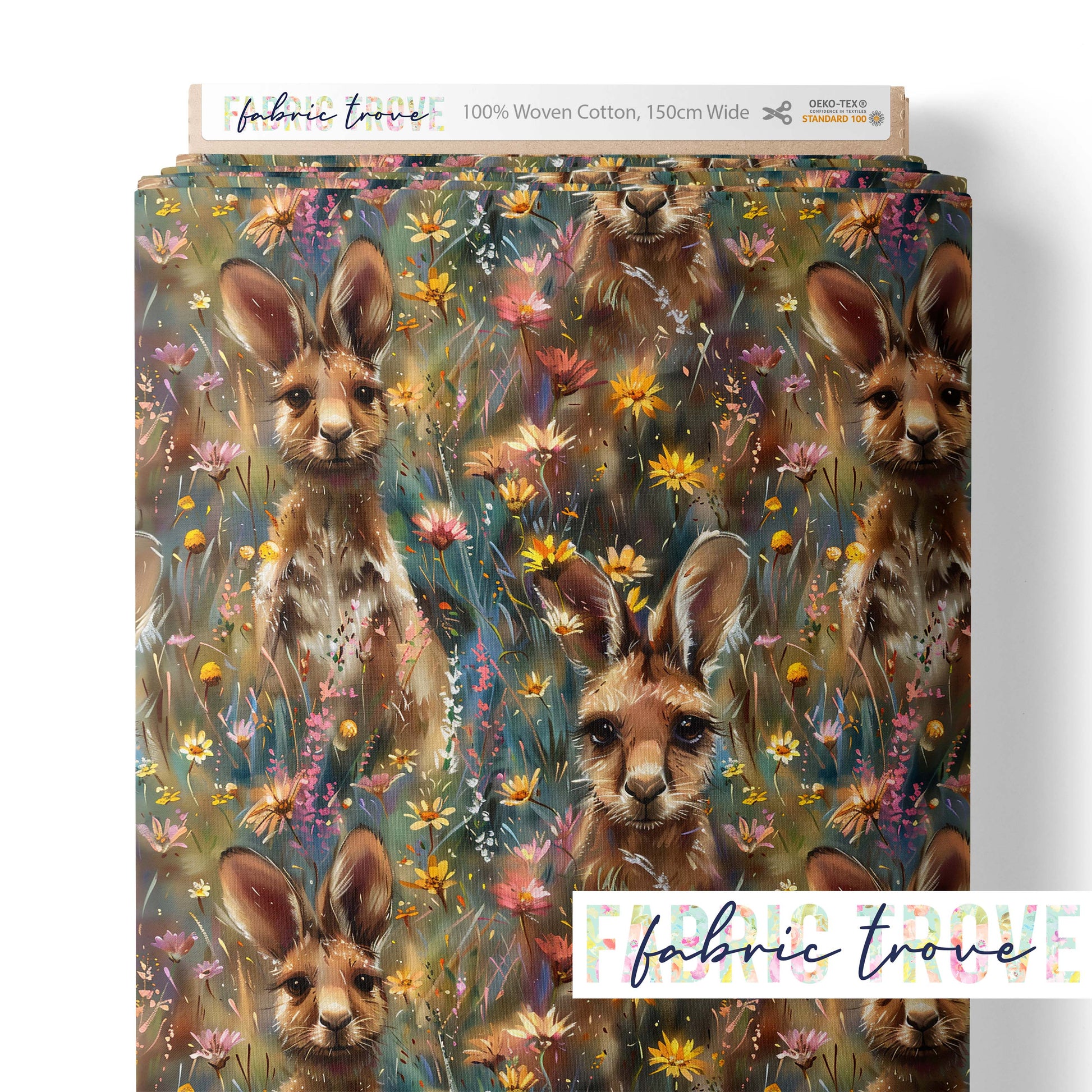 Joey Lookout is a fine art-style print featuring joey kangaroos in fields of wildflowers in warm, neutral tones of brown, yellow, and green, brought to life on premium cotton fabric.