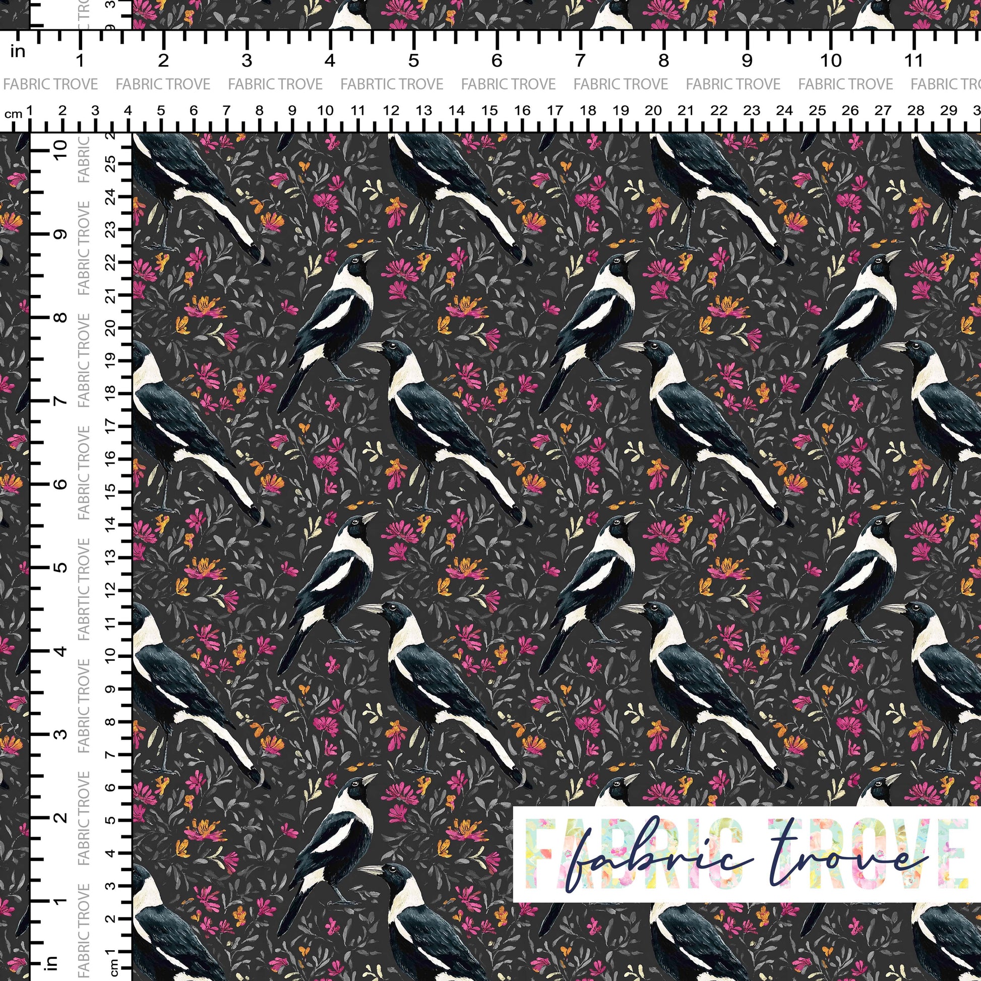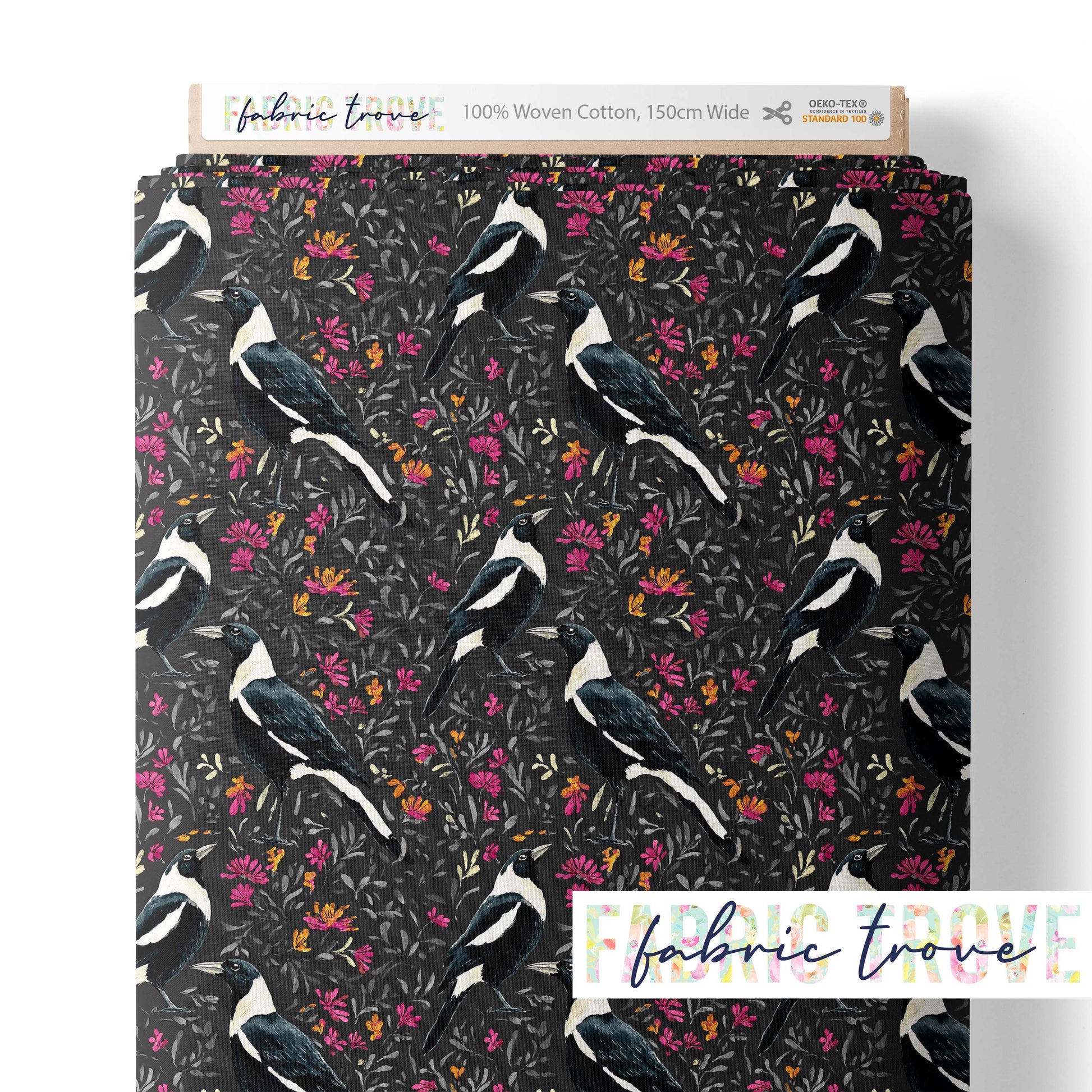 Morning Worblers is a detailed watercolour print featuring Australian magpies on a rich dark dark background with pink wildflowers, brought to life on premium cotton fabric.
