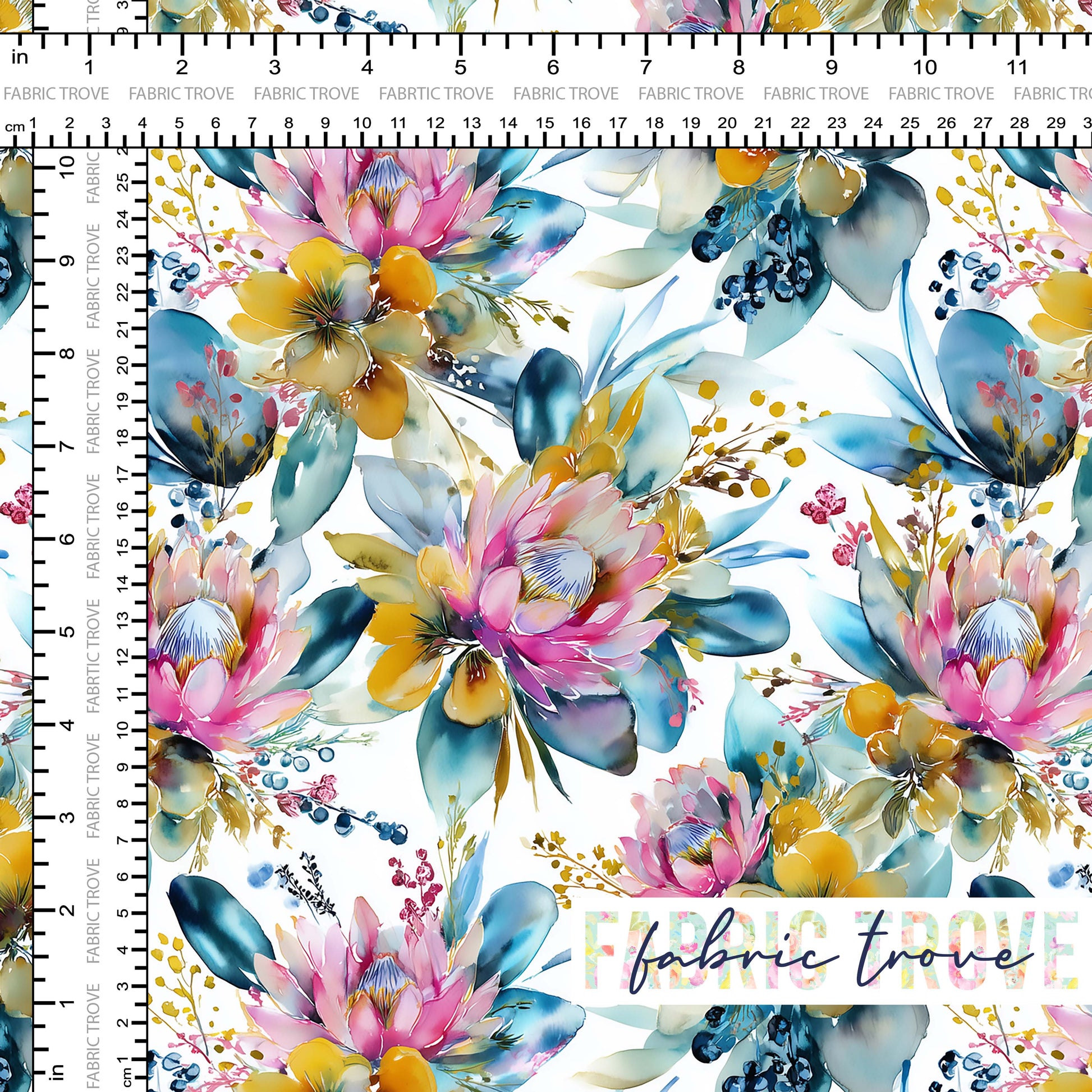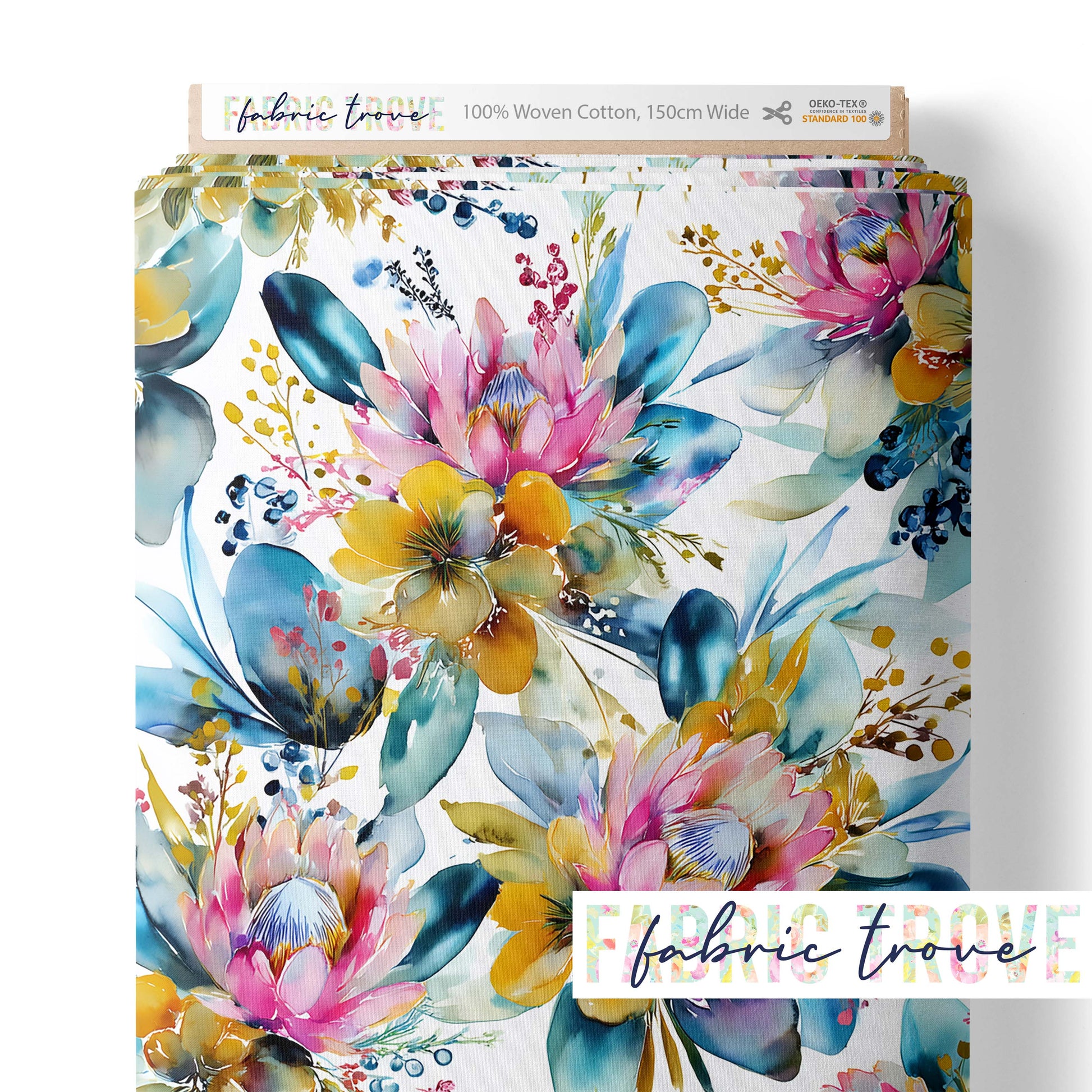 Protea Fantasy is a bold watercolour print featuring large proteas in pink, blue, and gold on a crisp white background, brought to life on premium cotton fabric.