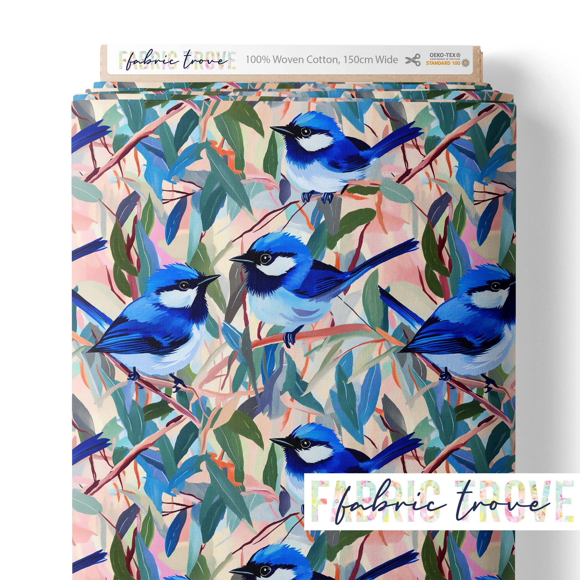 Celebrate Australia's beautiful native birds with Splendid Wrens, a stunning watercolor print featuring splendid wrens in gum trees on premium cotton fabric.
