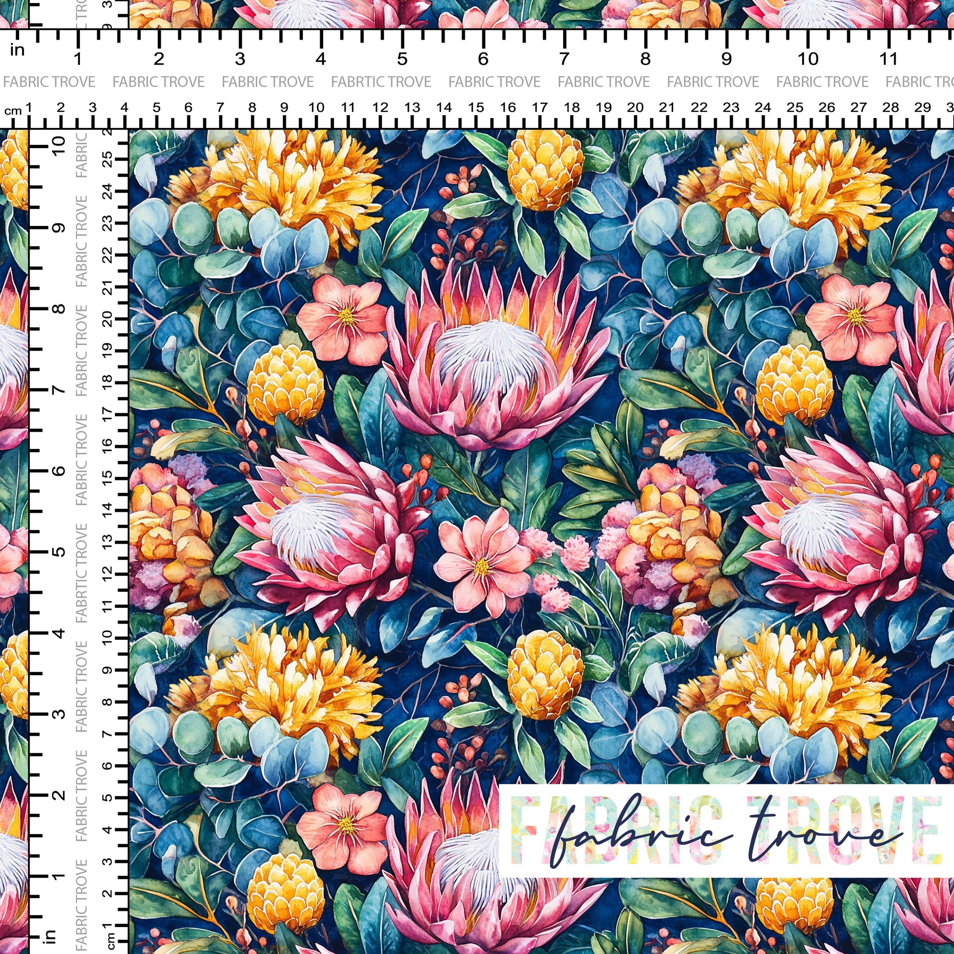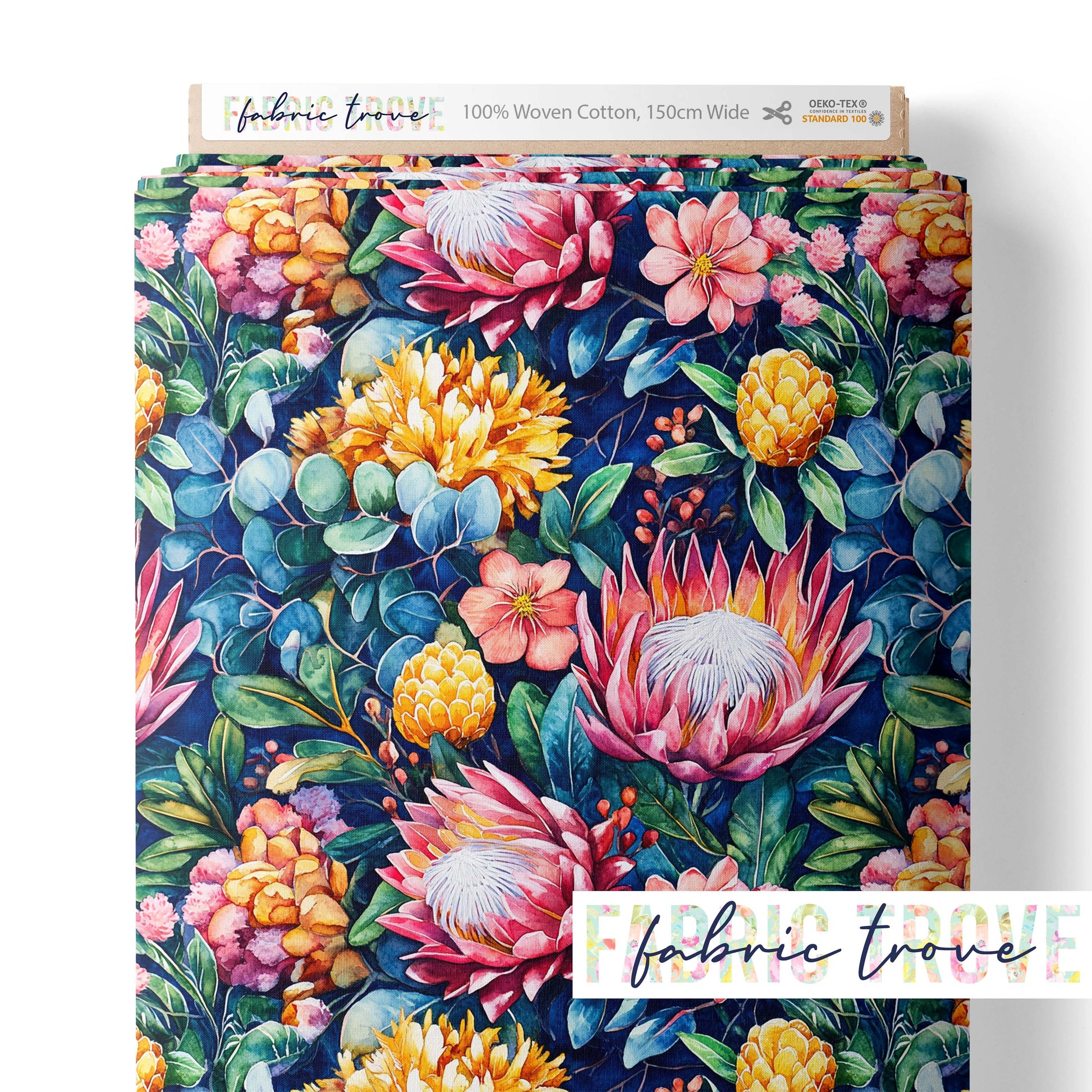 Celebrate Australia's stunning native flora with Warratah Bouquet, a beautiful print featuring wild flowers on a navy blue background on premium cotton fabric.
