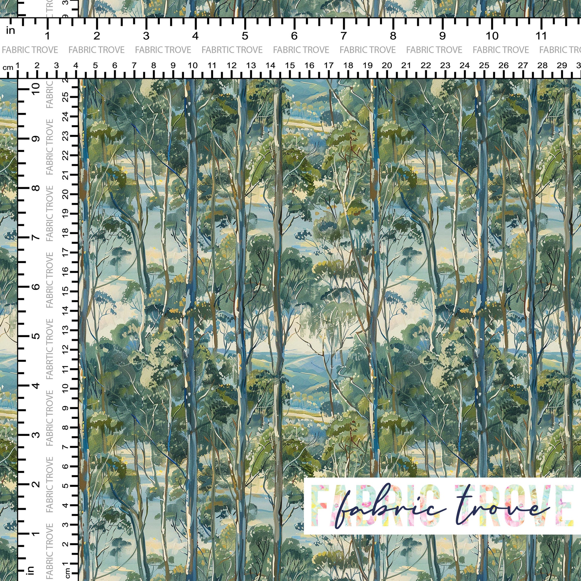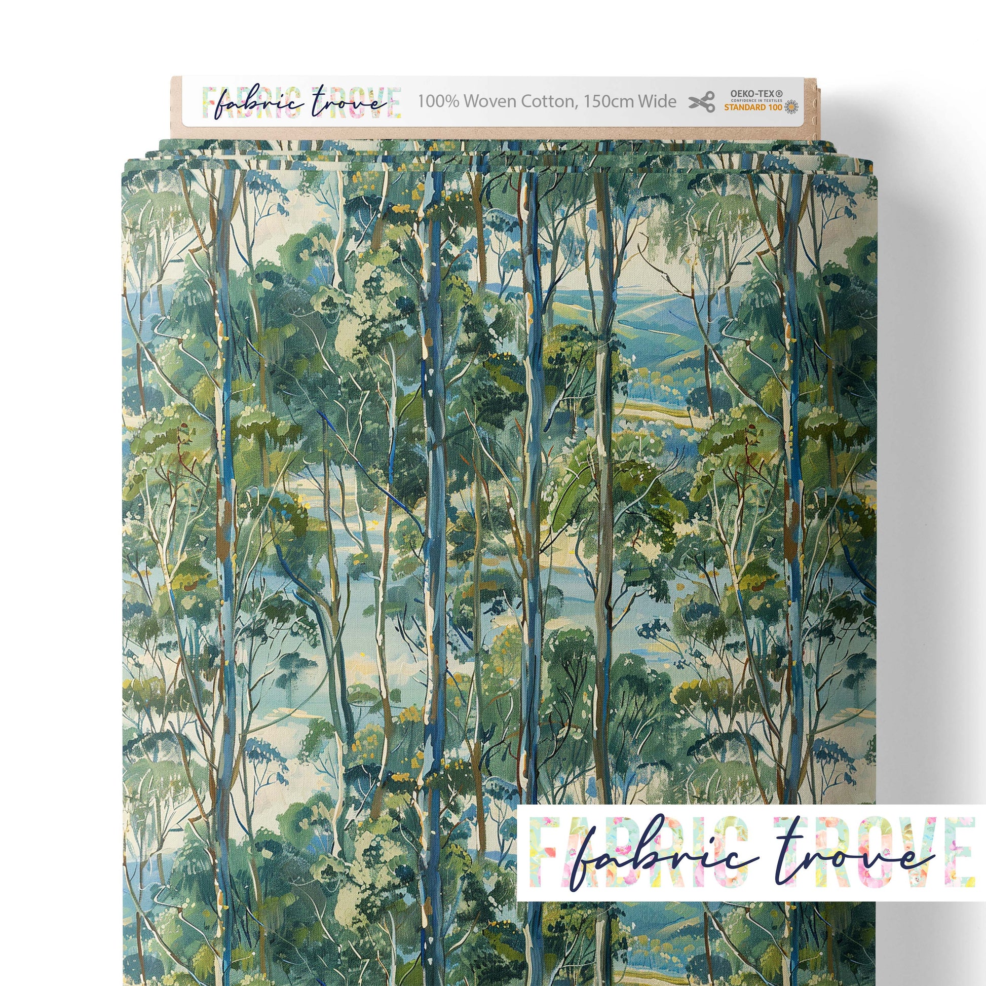 Watercolour Gum is a serene print featuring lines of gum trees in neutral greens and blues against an open sky background, brought to life on premium cotton fabric.