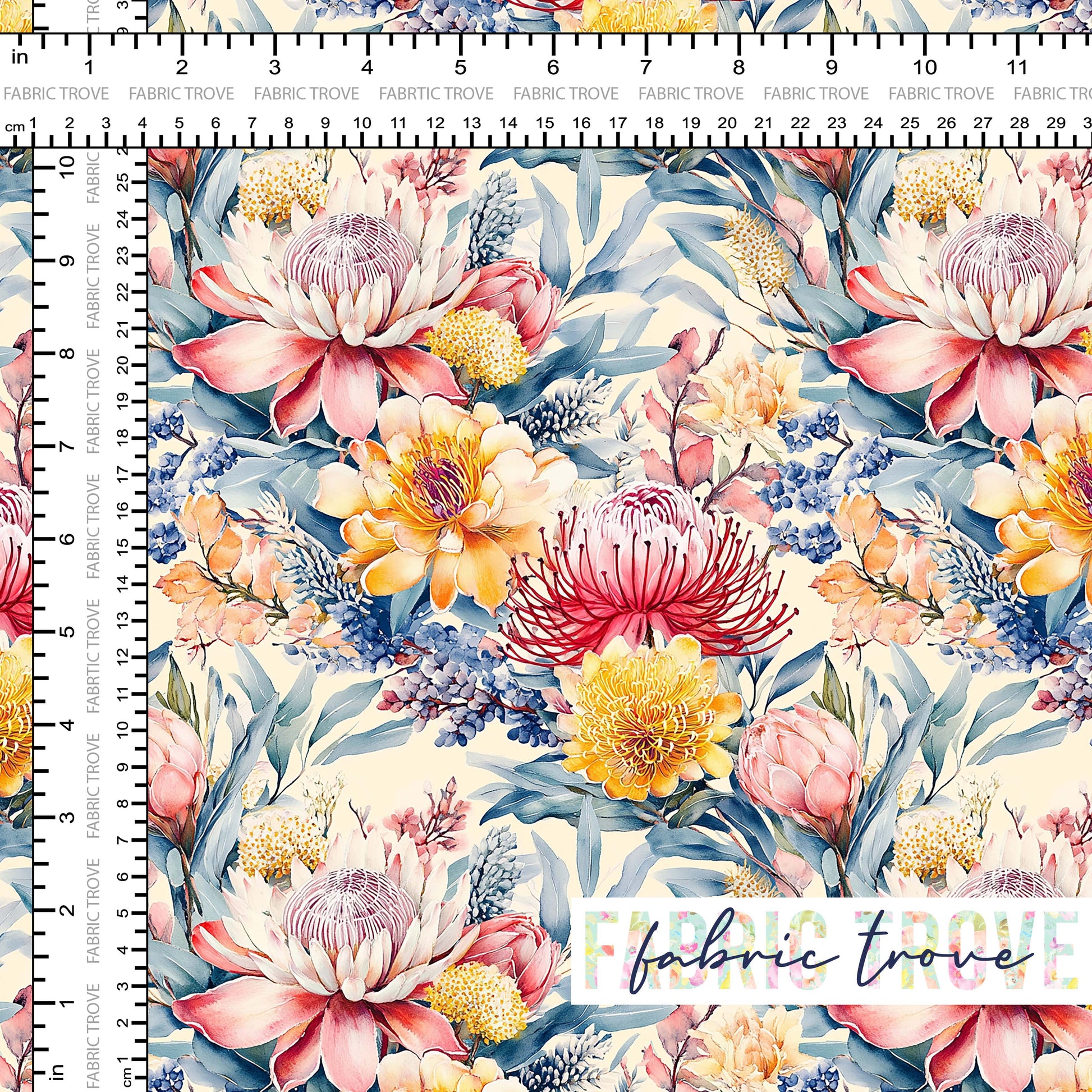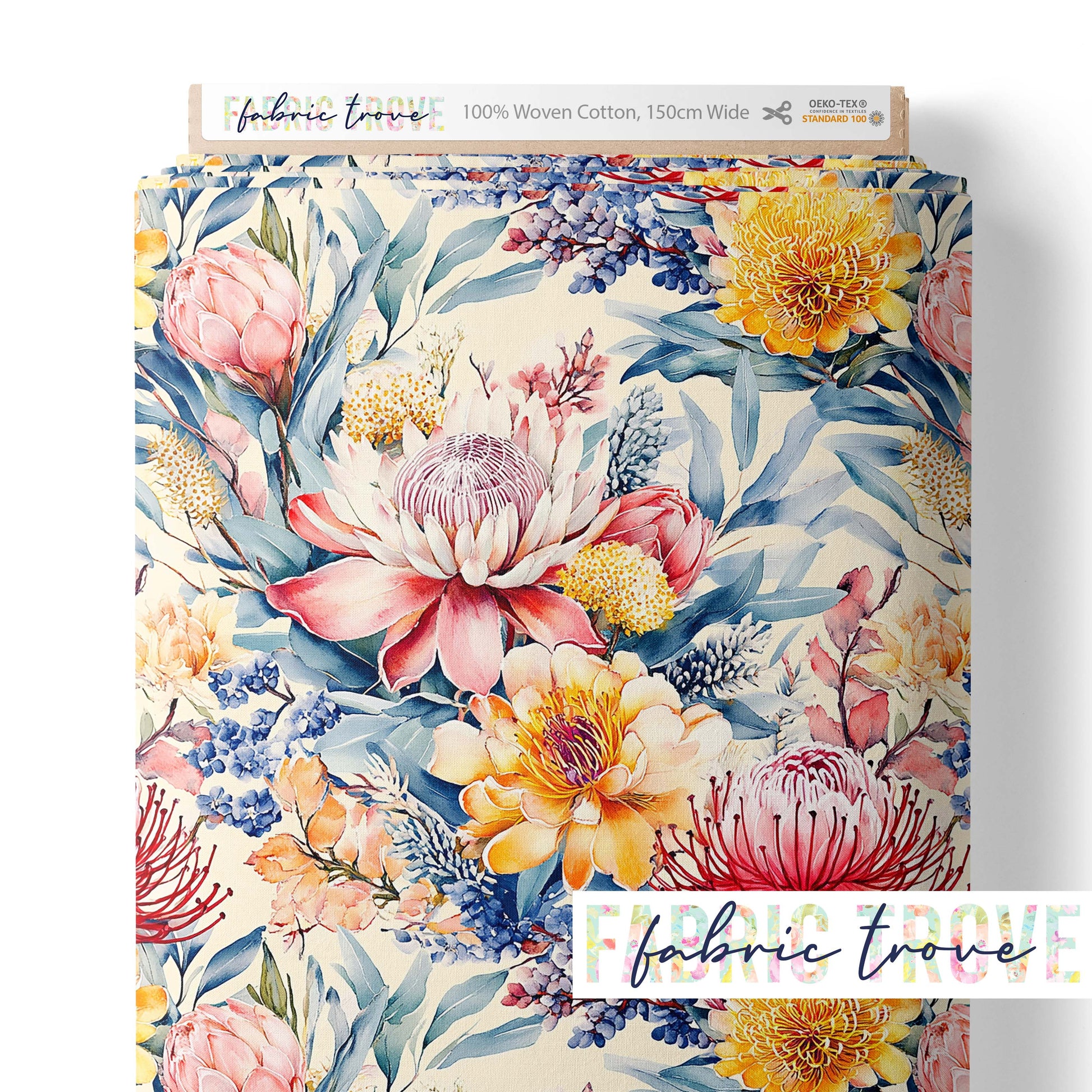 Add vibrant beauty to your projects with WhisperingProtea, a stunning print featuring vibrant wildflowers on premium cotton fabric.
