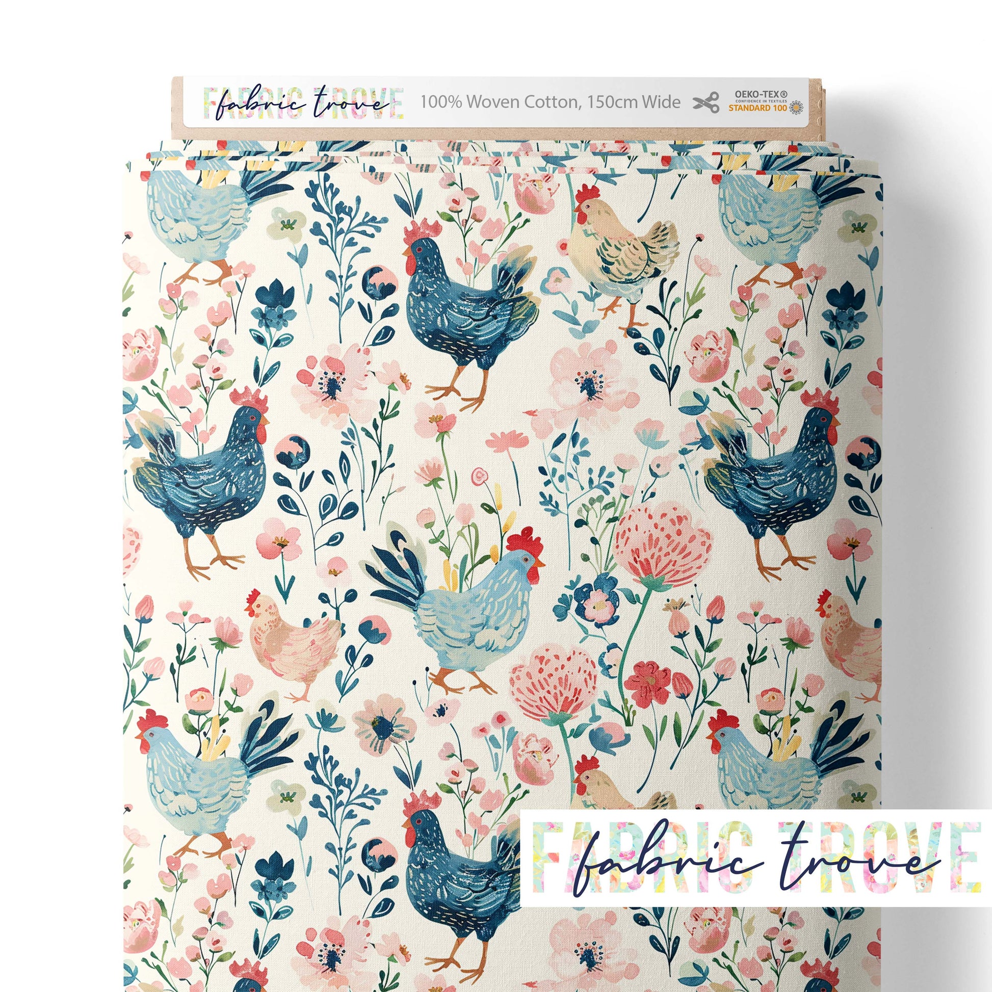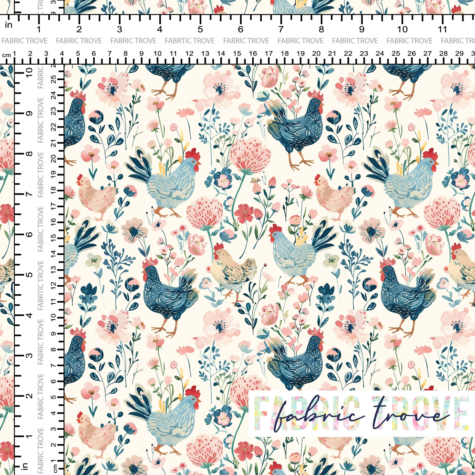 Add farmyard charm to your projects with Pastel Chickens, a delightful print featuring pastel-colored chickens in a flower field on premium cotton fabric.
