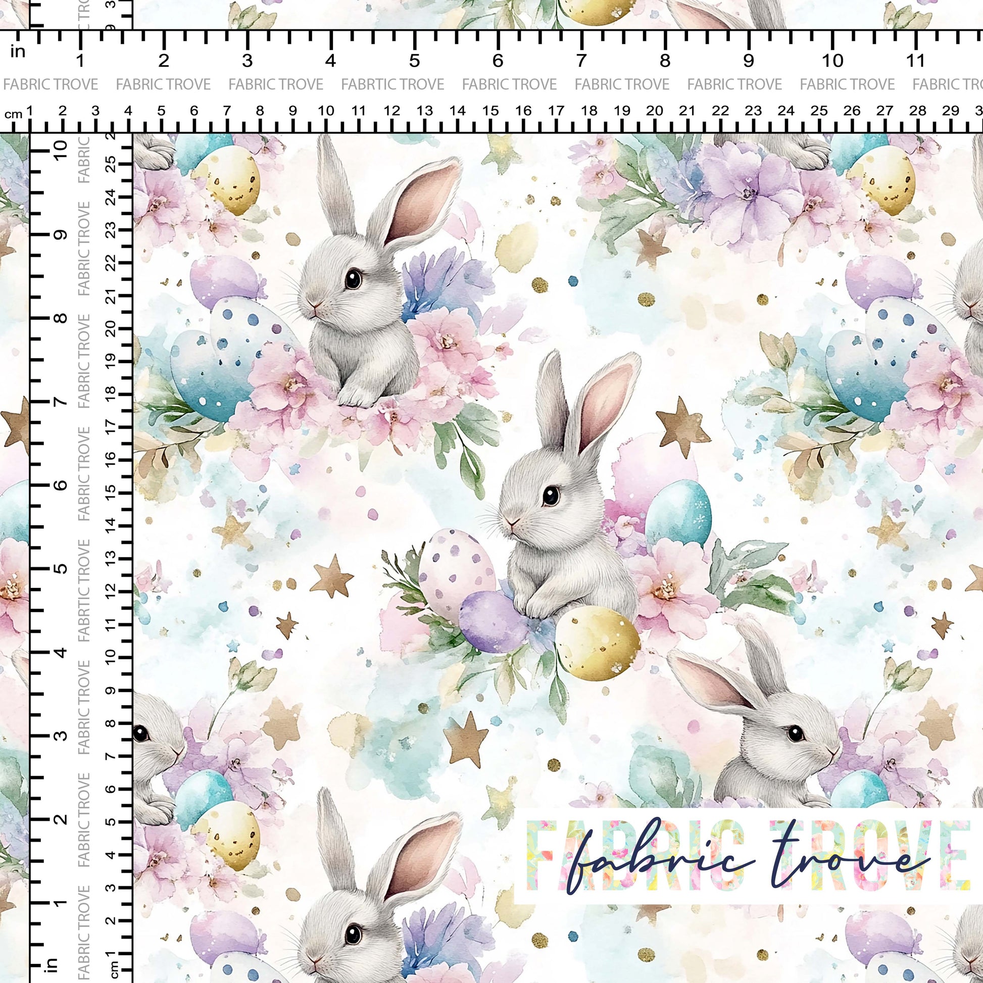 Create serene Easter magic with Easter Peace, an ethereal print featuring white bunnies, stars, flowers, and eggs on a soft white background on premium cotton fabric.
