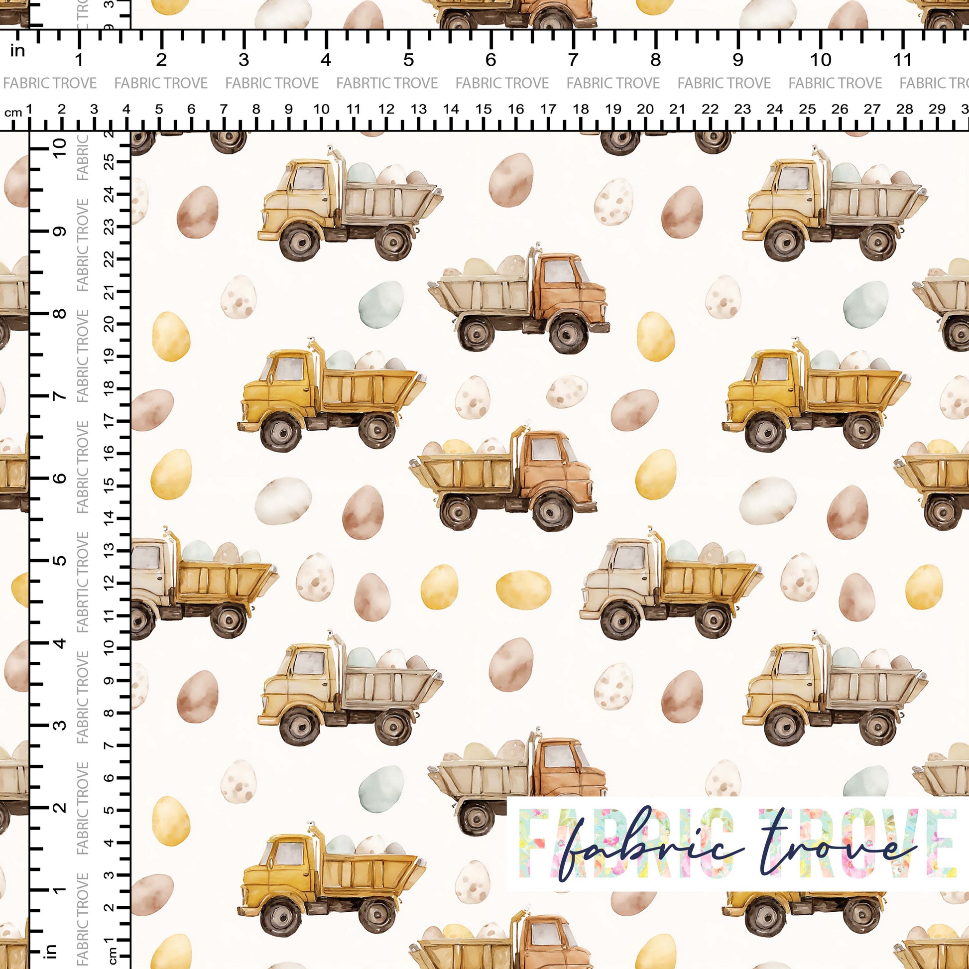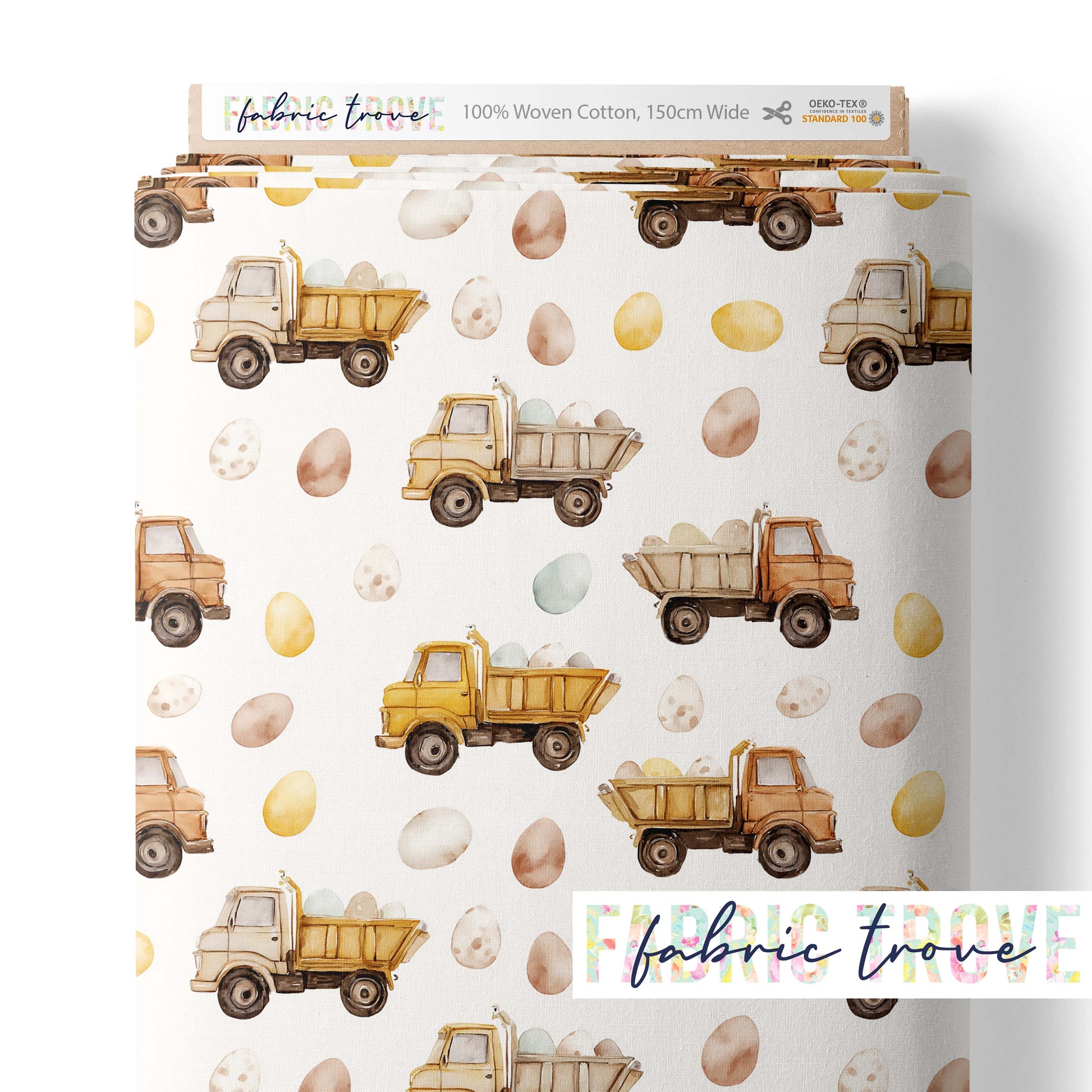 Add playful Easter charm to your projects with Egg Dumpers, a fun print featuring trucks carrying Easter eggs surrounded by neutral colores eggs on premium cotton fabric.