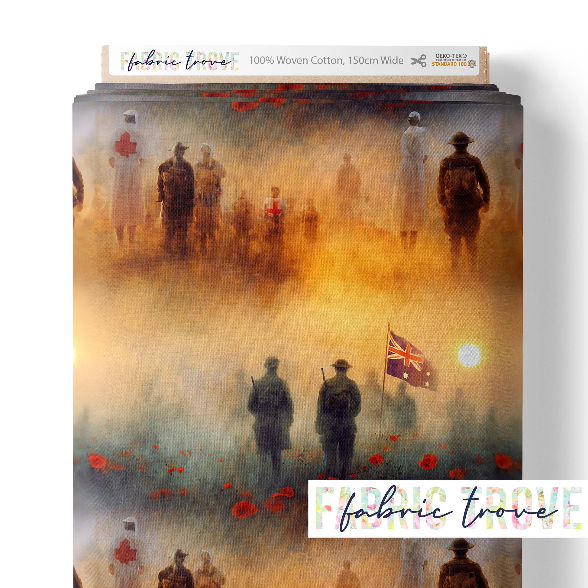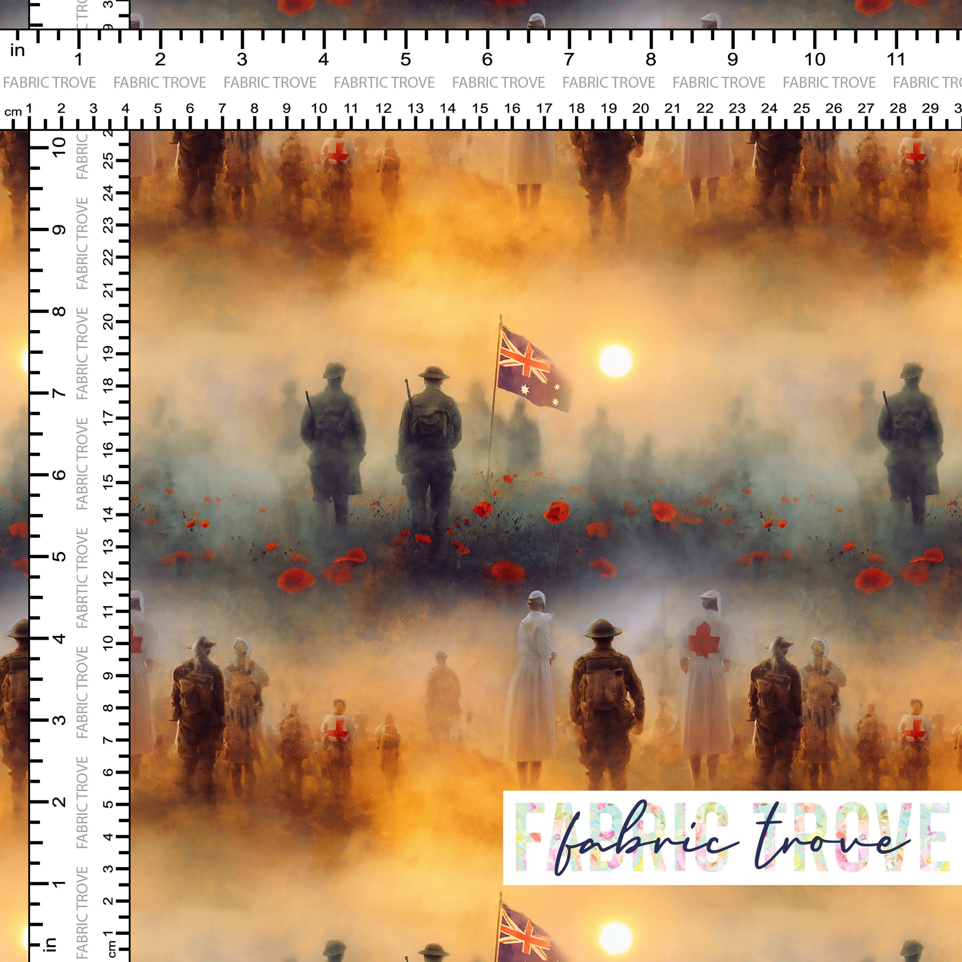 Honor Australia's heroes with Honor And Respect, a vintage-inspired print featuring Australian soldiers and nurses against a sunset Australian flag on premium cotton fabric.