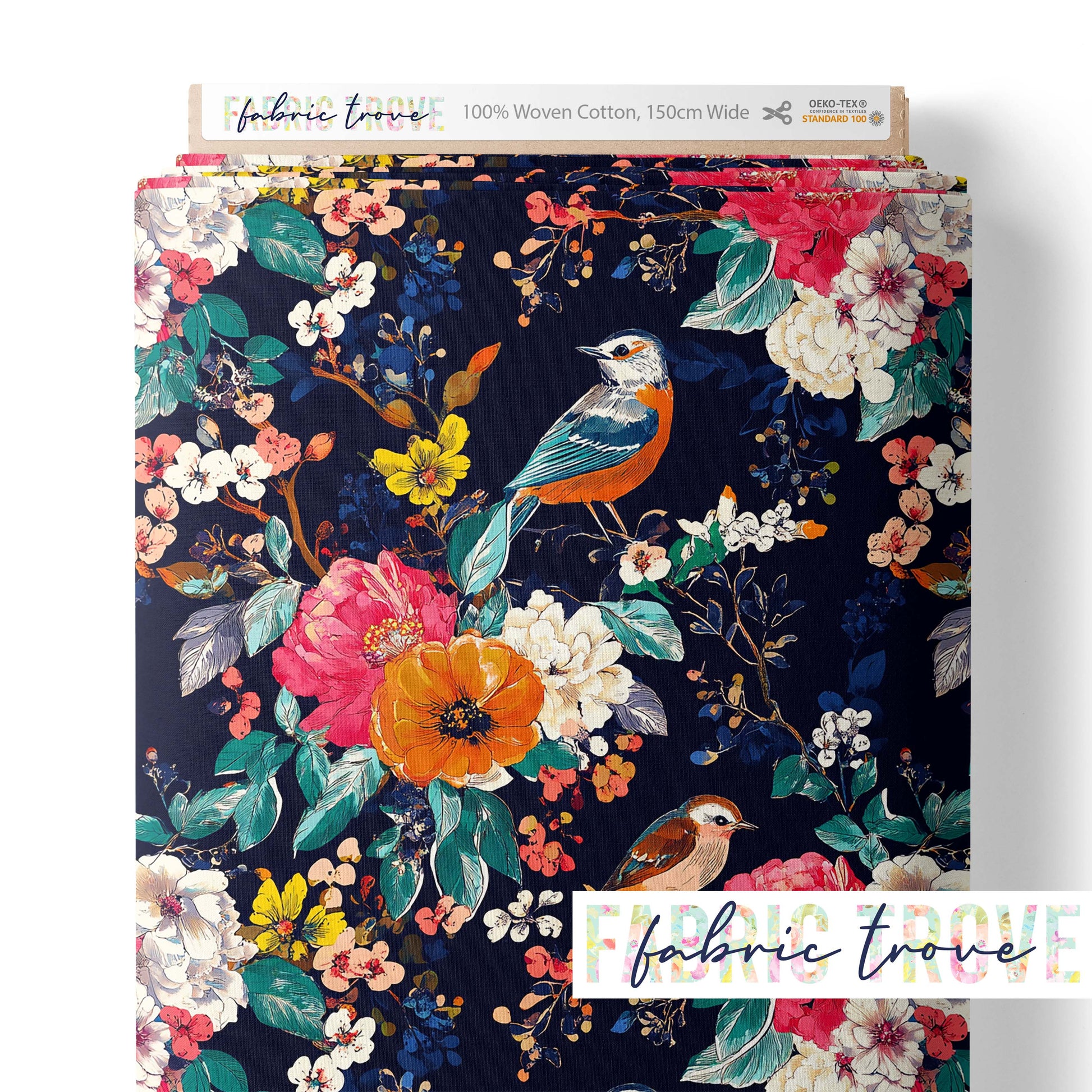 Add timeless elegance to your projects with Country Garden, an exquisitely detailed chinoiserie-inspired print featuring birds and intricate botanical elements on a rich dark blue background on premium cotton fabric.