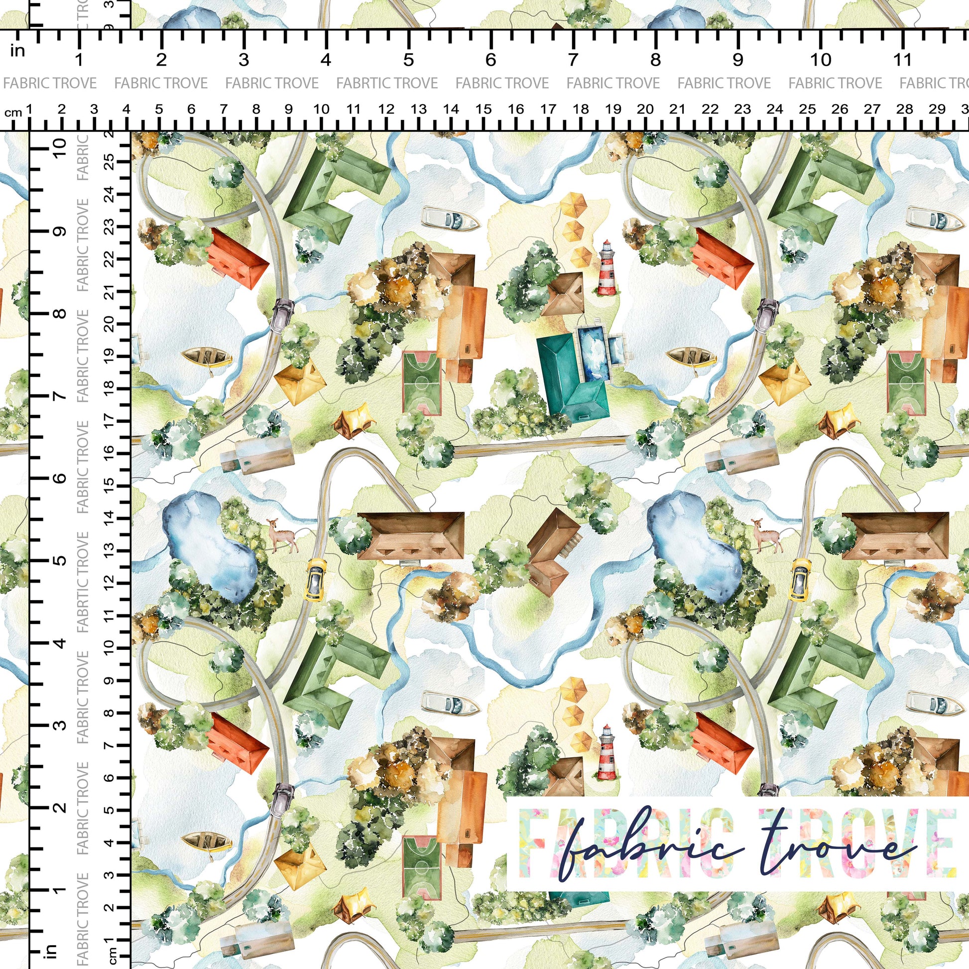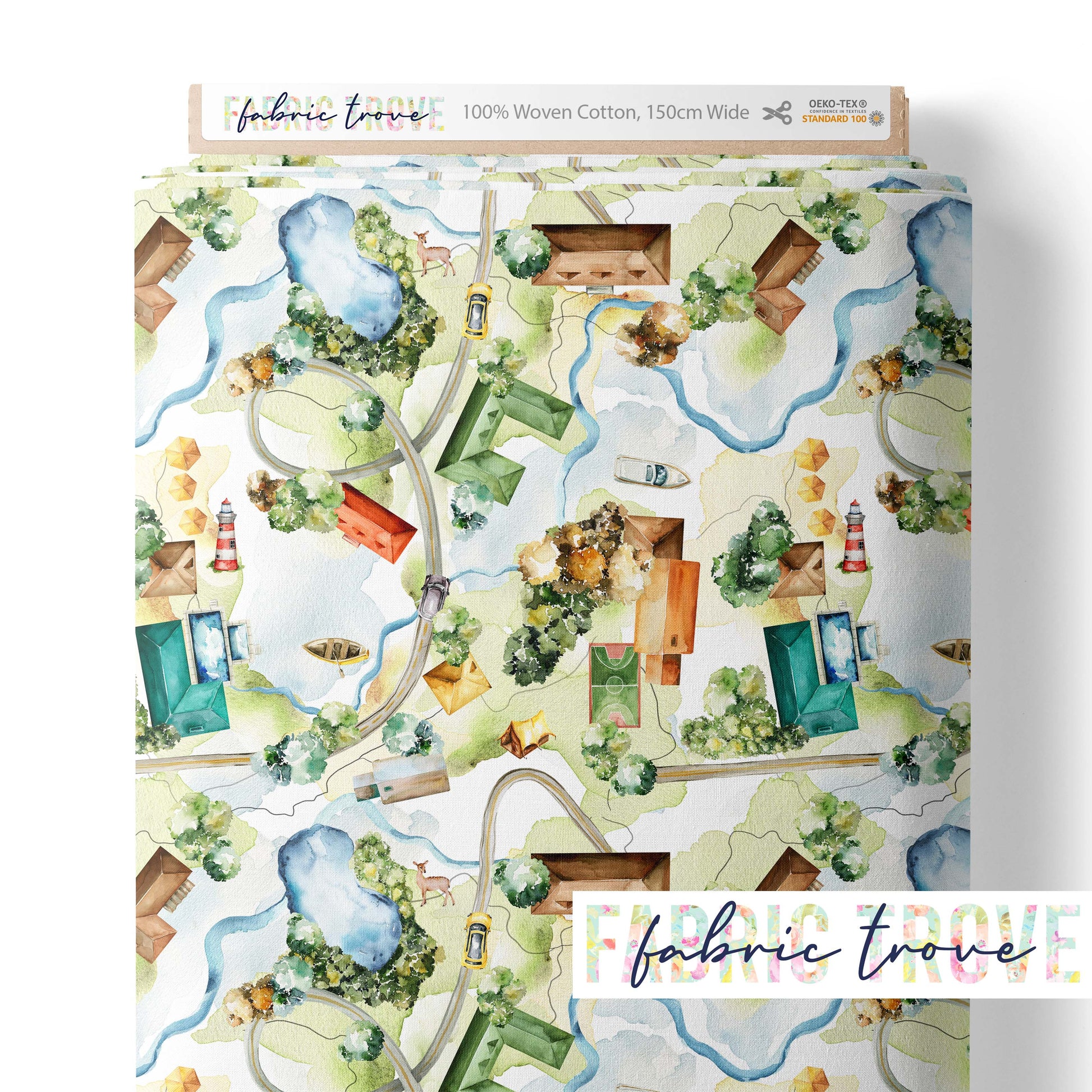 Add artistic urban style to your projects with Urban Planning, a unique watercolor print featuring an urban area viewed from above with buildings, landscape, and roads on premium cotton fabric.